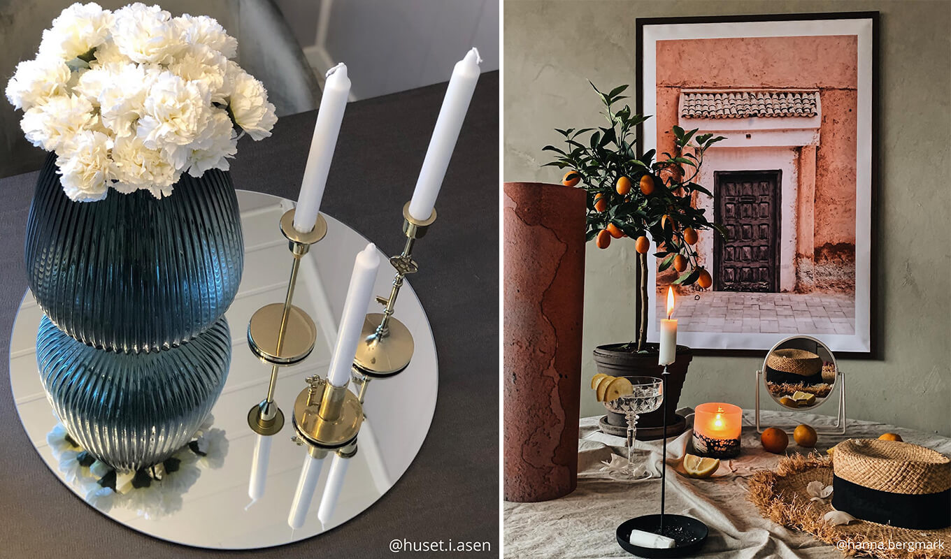 Огледалният поднос е специфичен продукт, който може да се закупи, но също така можеш просто да използваш обикновено огледало като поднос за свещи, фенери, цветя или други декоративни елементи. Кръглите огледала са особено елегантни за тази цел.