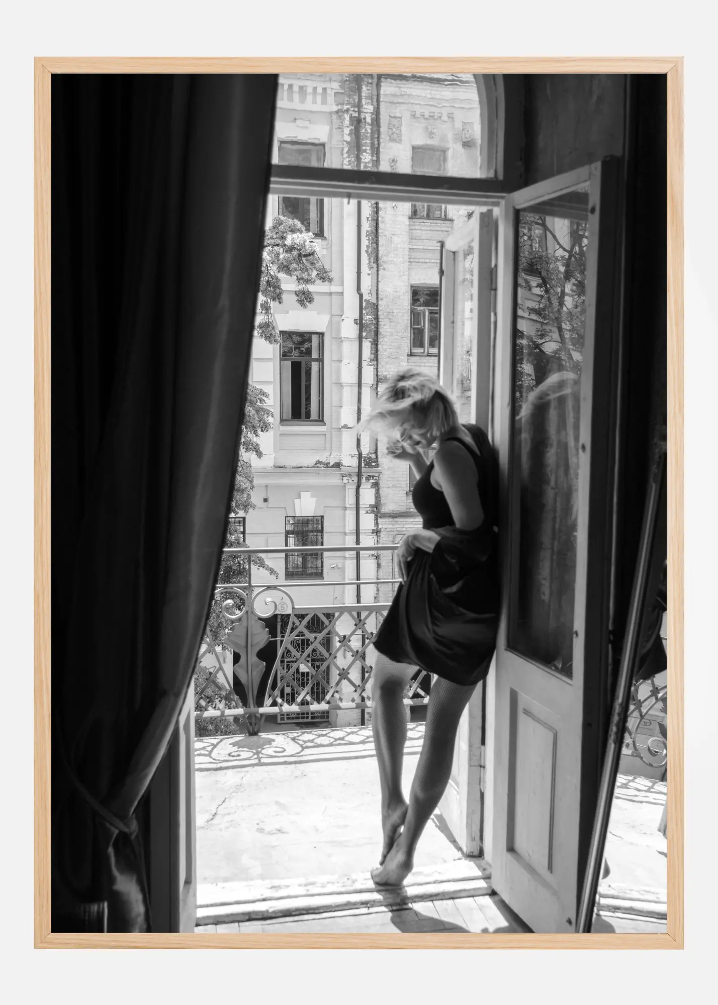 Класически постер с жена на балкон в Париж. Жената носи черна рокля, която удължава нейните голи крака, докато се обляга на врата, стоейки на пръсти и гледайки своите стъпала. Комбинирайте този черно-бял постер със стена в светли цветове, за да добавите нотка елегантност.