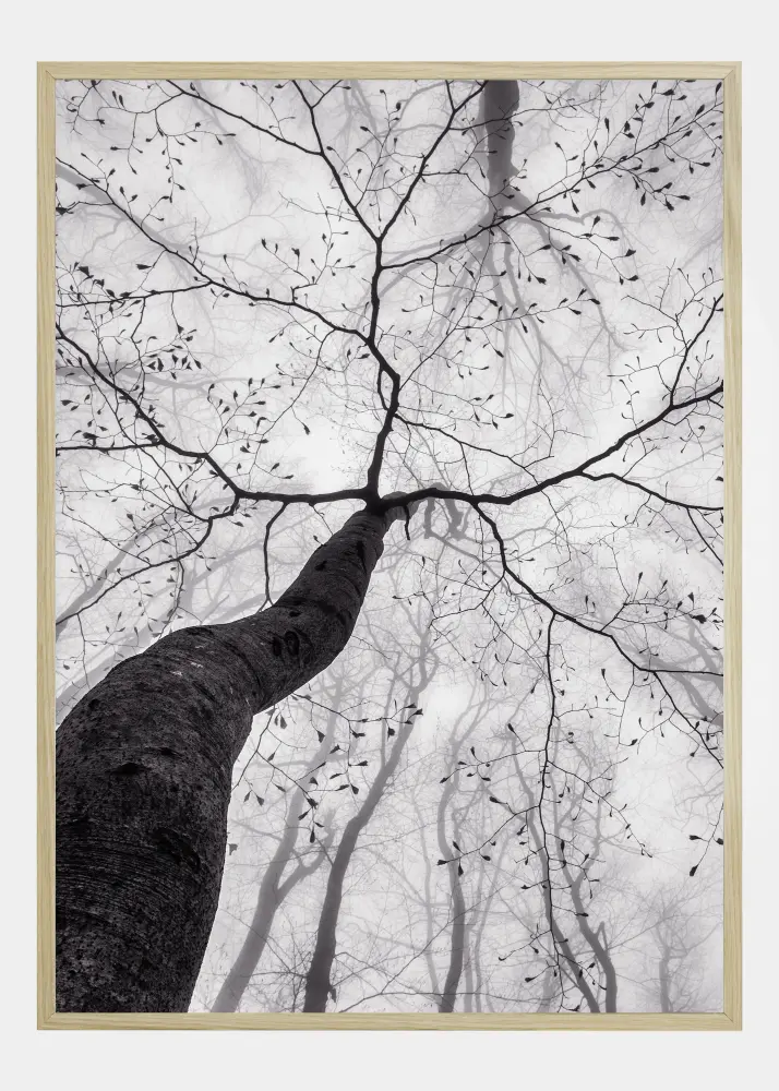 Плакат на природна тема с дърво, което се издига към небето. Нека погледът ви следва ствола нагоре към клоните, които се разпростират към небето. Дърветата с мек фокус изпълват фона със своите листа. Тази черно-бяла снимка е добро допълнение към стената ви, което ви позволява да усетите спокойствието на природата.