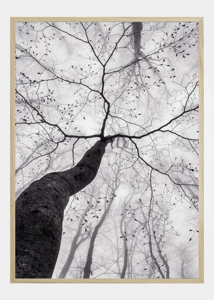 Естествен плакат с дървесен ствол, който се издига нагоре към небето. Нека погледът ви се издига нагоре по ствола към клоните, които се разпростират към небето. Дърветата с мек фокус запълват фона с листата си. Тази черно-бяла снимка е добро допълнение на стената ви, която ви позволява да почувствате спокойствието на природата.
