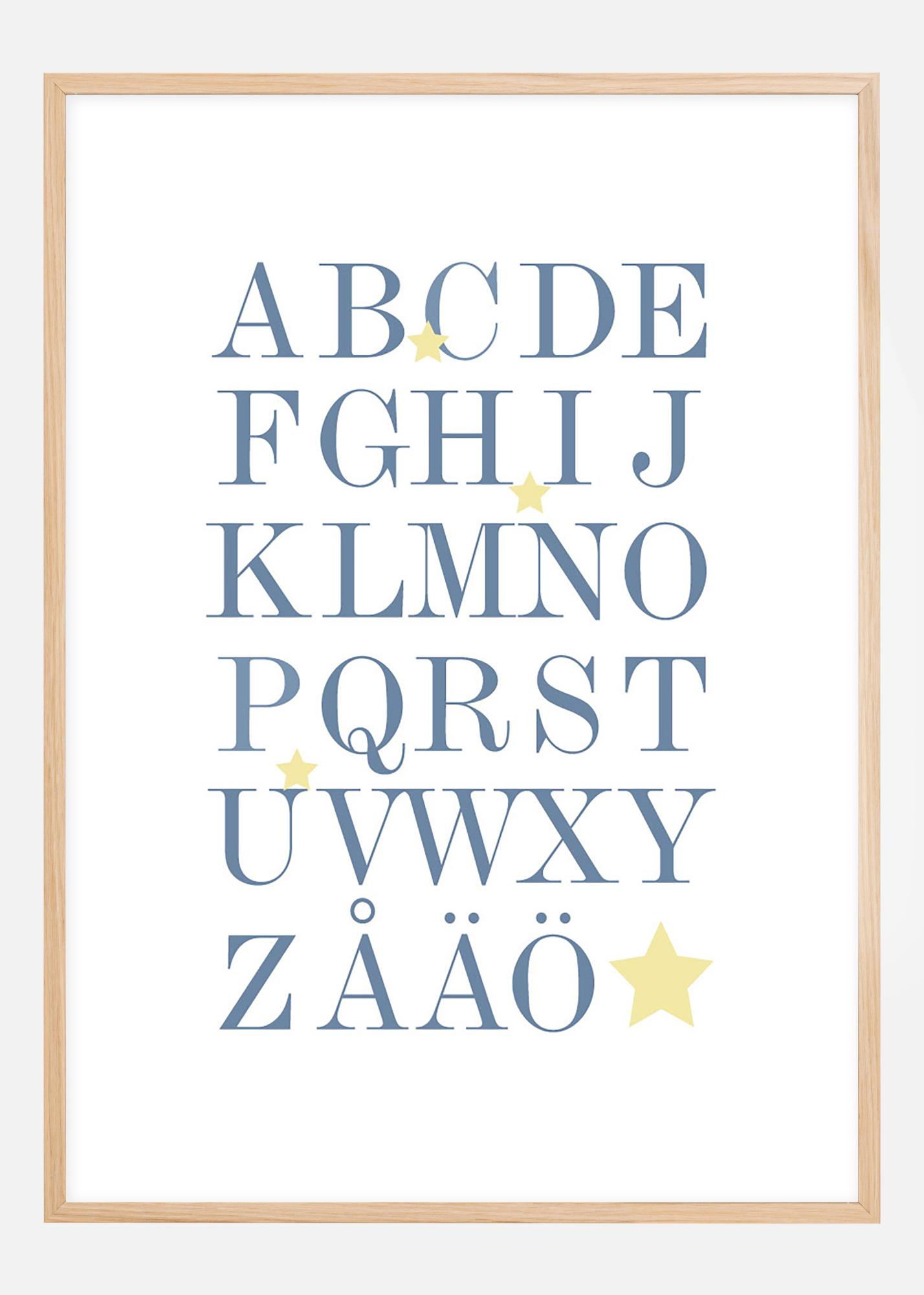 Плакат с цялата азбука, A-Ö, в синьо и звезди в бежово. Педагогическият мотив е подходящ за детската стая за упражнение на азбуката, но също така и за други стени в дома. Стилният израз прави плаката подходящ за всички интериорни стилове и видове домове. Комбинирайте с други картини за стена с тематика или декорирайте стената заедно с плаката с числата 1-10.