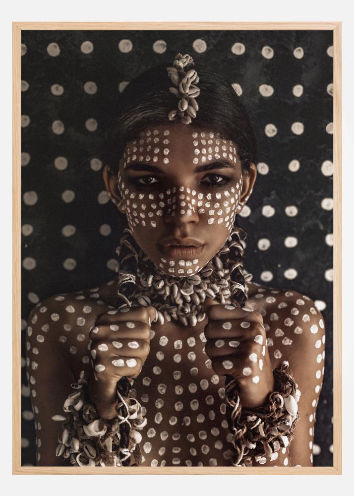 Тук ще срещнете твърдия поглед на млада аборигенка с бяло телесно боядисване и красиви бижута от природно въже и миди. Земна фотографична плакатно изкуство, което се вписва еднакво добре както в самостоятелният си величествен вид, така и на модерната стена за картини.