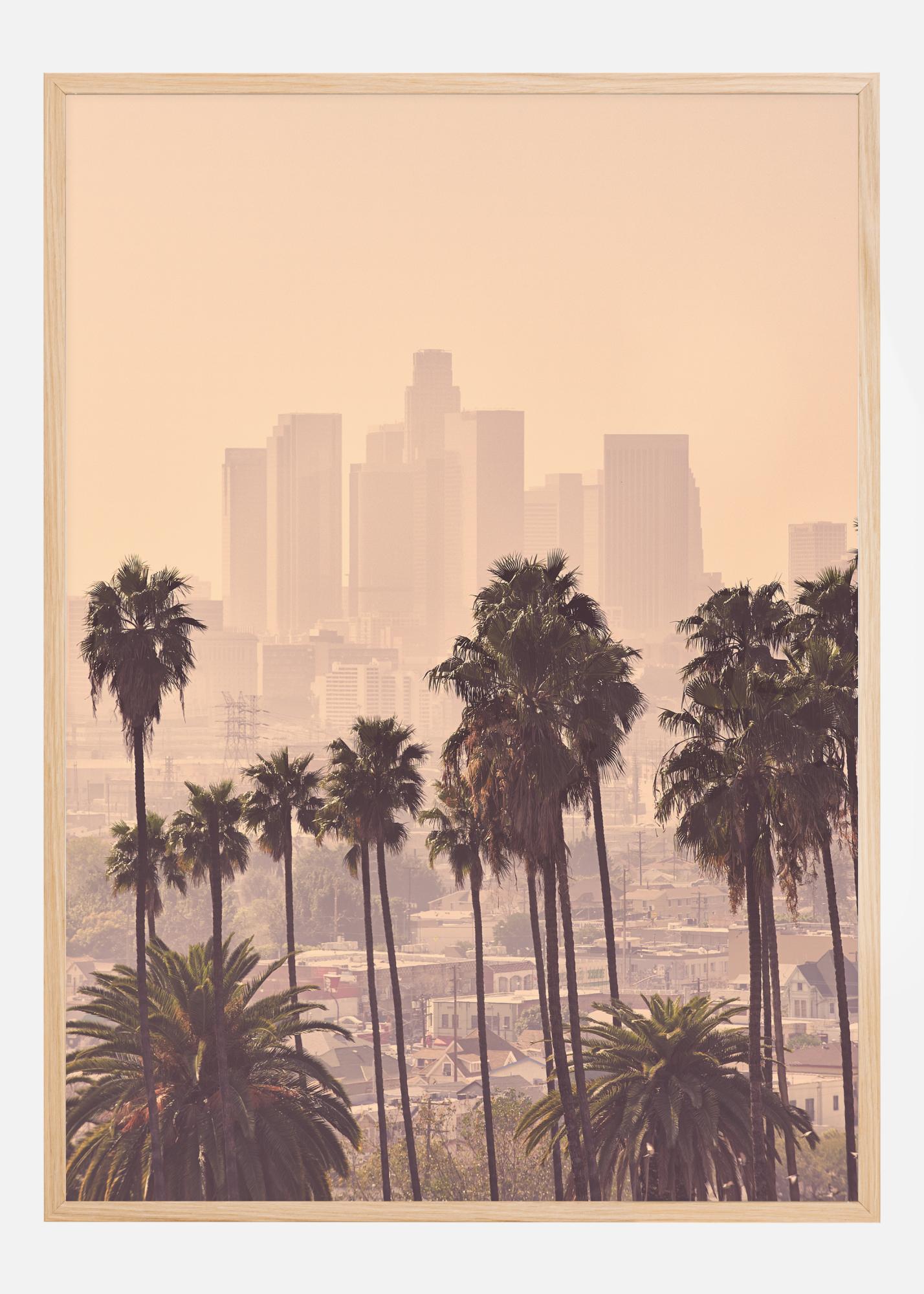 Плакат с градски пейзаж с лисичи опашки палми на преден план и силуета на град на заден план. Палмите са на ясен фокус, а замъглените небостъргачи на заден план насочват вниманието към природата. Може да почувствате аурата на градския живот в този изразителен творба в сепийни тонове.