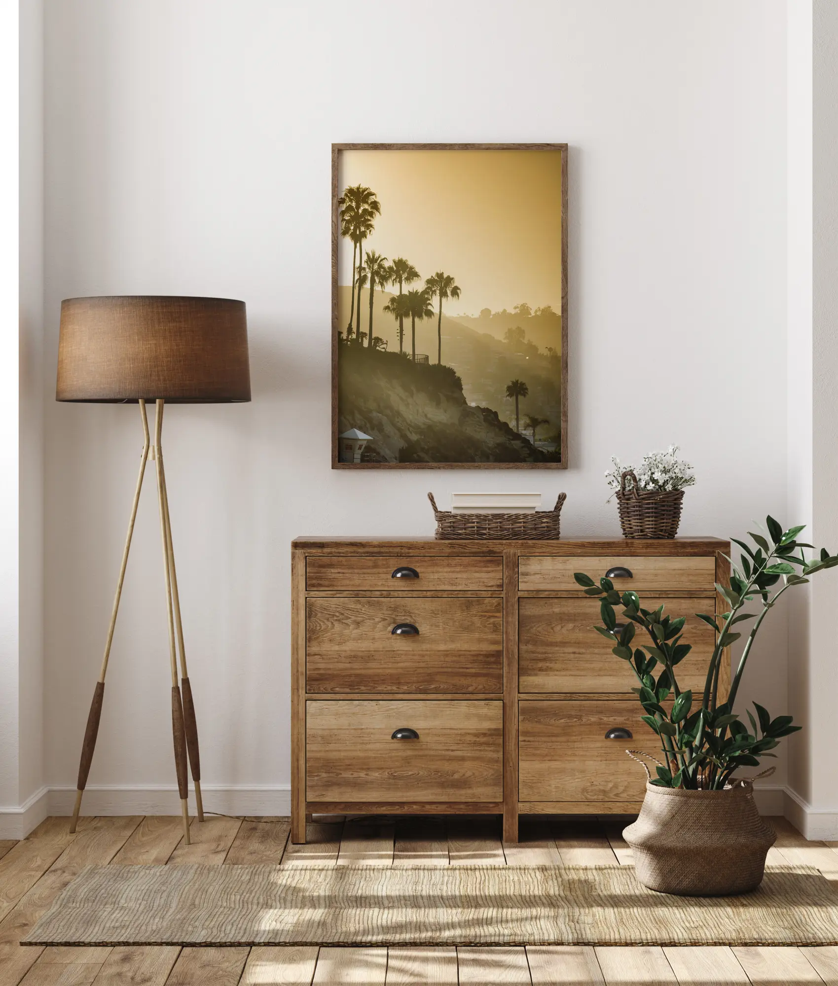 Един фантастичен силуетен постер с палми до хълм с изглед към стар град. Сепийните тонове улавят мъгливата сутрешна светлина, докато слънцето изгрява зад хълмовете и осветява сцената. Постерът предизвиква усещане за топлина и спокойствие, идеален за спокоен кът в дома.