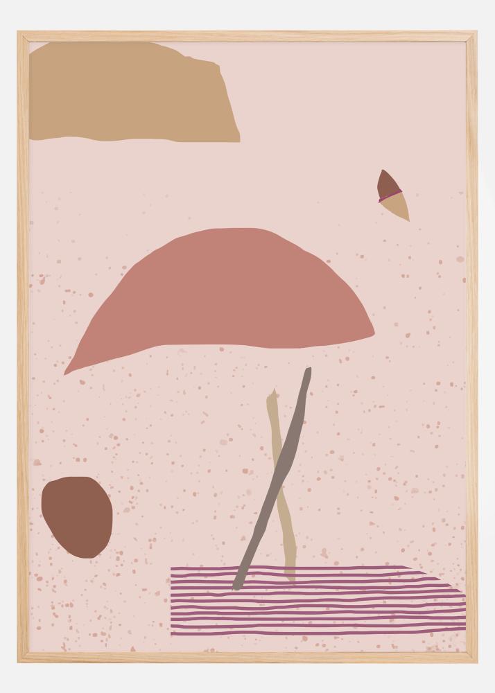 Абстрактен плакат с червени, бежови, розови и лилави форми на мек петнист фон. Насладете се на успокояващия ефект на формите и размислете върху значението, когато видите топка, облачна форма, пръчки, килим или чадър в произведението. Меките тонове са перфектни, например за стена в баня.
