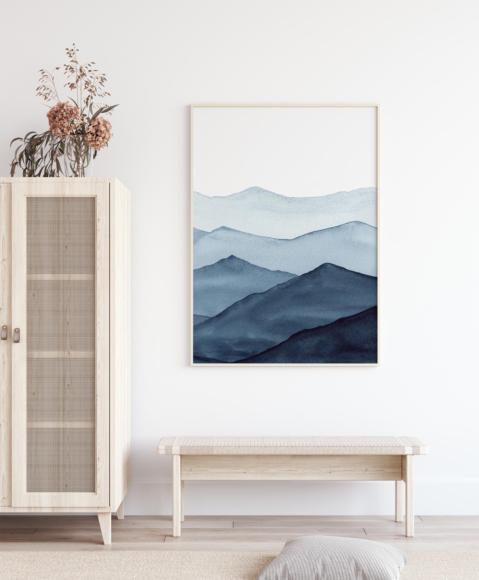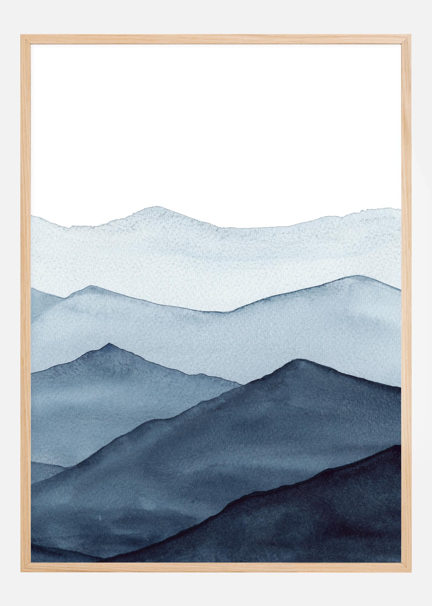 Фантастичен минималистичен постер на редица сини планини. Най-близката планина е в тъмен нюанс на синьо, където цветовете стават по-избледнели, когато планините се отдалечават в далечината. Меките сини цветове са идеални за създаване на хладна, но успокояваща атмосфера, когато се вглеждате в далечината.