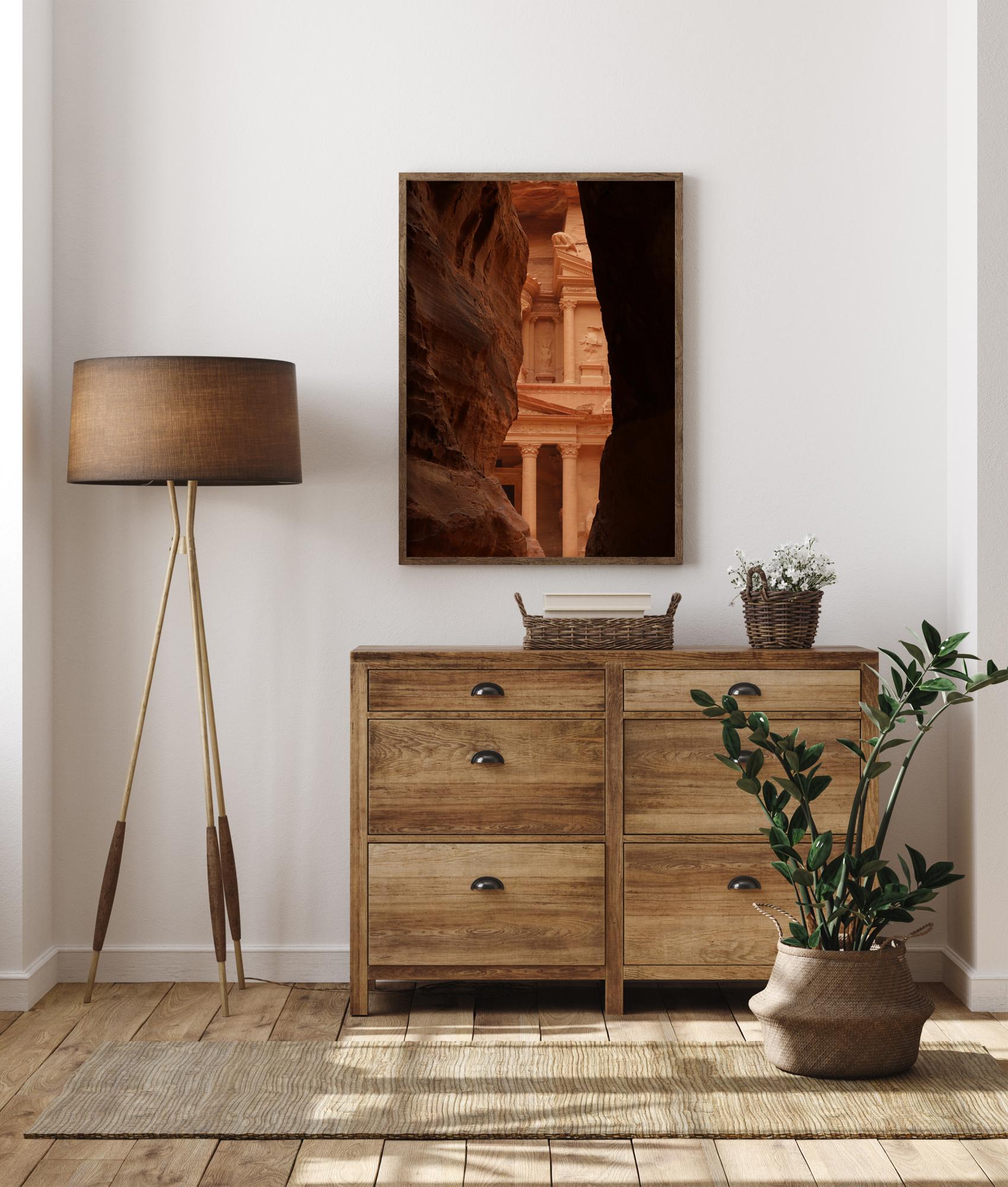 Плакат на забележителност от ъгъл на Петра в Йордания. Погледнете част от фасадата през червените скали на това невероятно чудо от античността. Закачете го у дома и се отправете на пътешествие, без да напускате къщата, докато изследвате старата архитектура на тази известна.