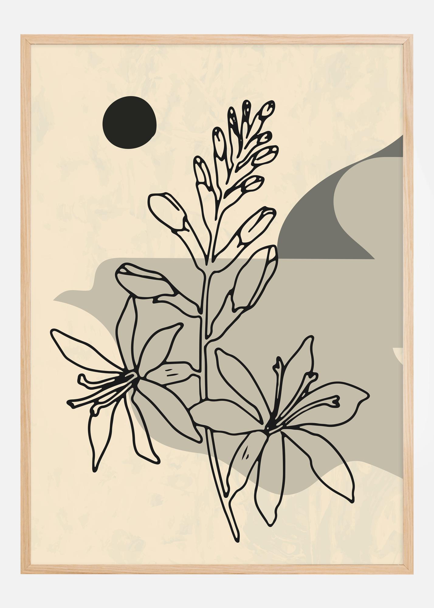 Този естетически привлекателен постер улавя абстрактна интерпретация на цветя в цъфтеж, където графични линии срещат органични форми. Произведението играе на неутрален фон в бежово, допълнено от тъмна, кръгла форма, която придава контраст и дълбочина. На преден план стилизирани цветя и пъпки се издигат нагоре в силует, създадени с остри черни контури, които придават силен визуален ефект.