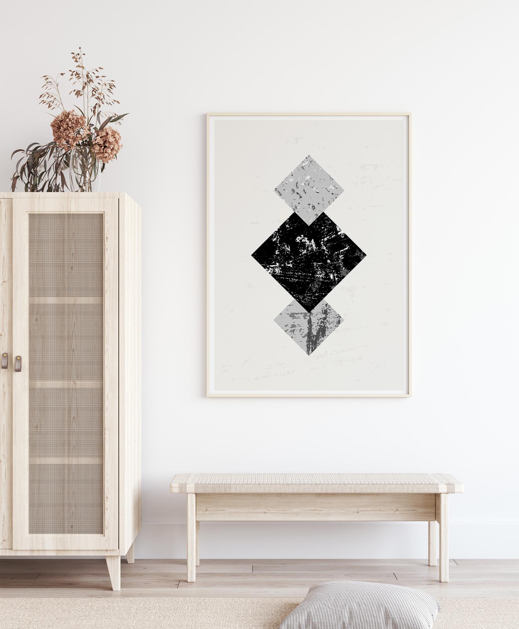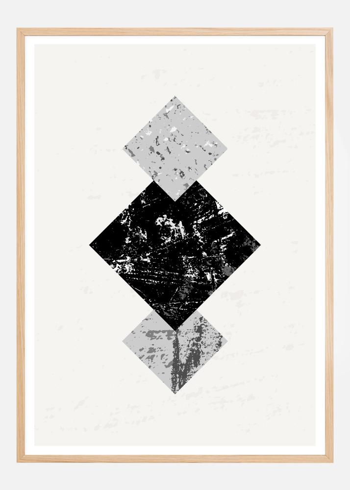 Геометричен постер с три квадрата, разположени в средата на бял фон. Големият квадрат в средата е черен с мраморни ефекти. От всяка страна има по два по-малки сини квадрата с мраморни и каменни ефекти. Окото се привлича през произведението с помощта на точките във всеки квадрат в това почти симетрично произведение.