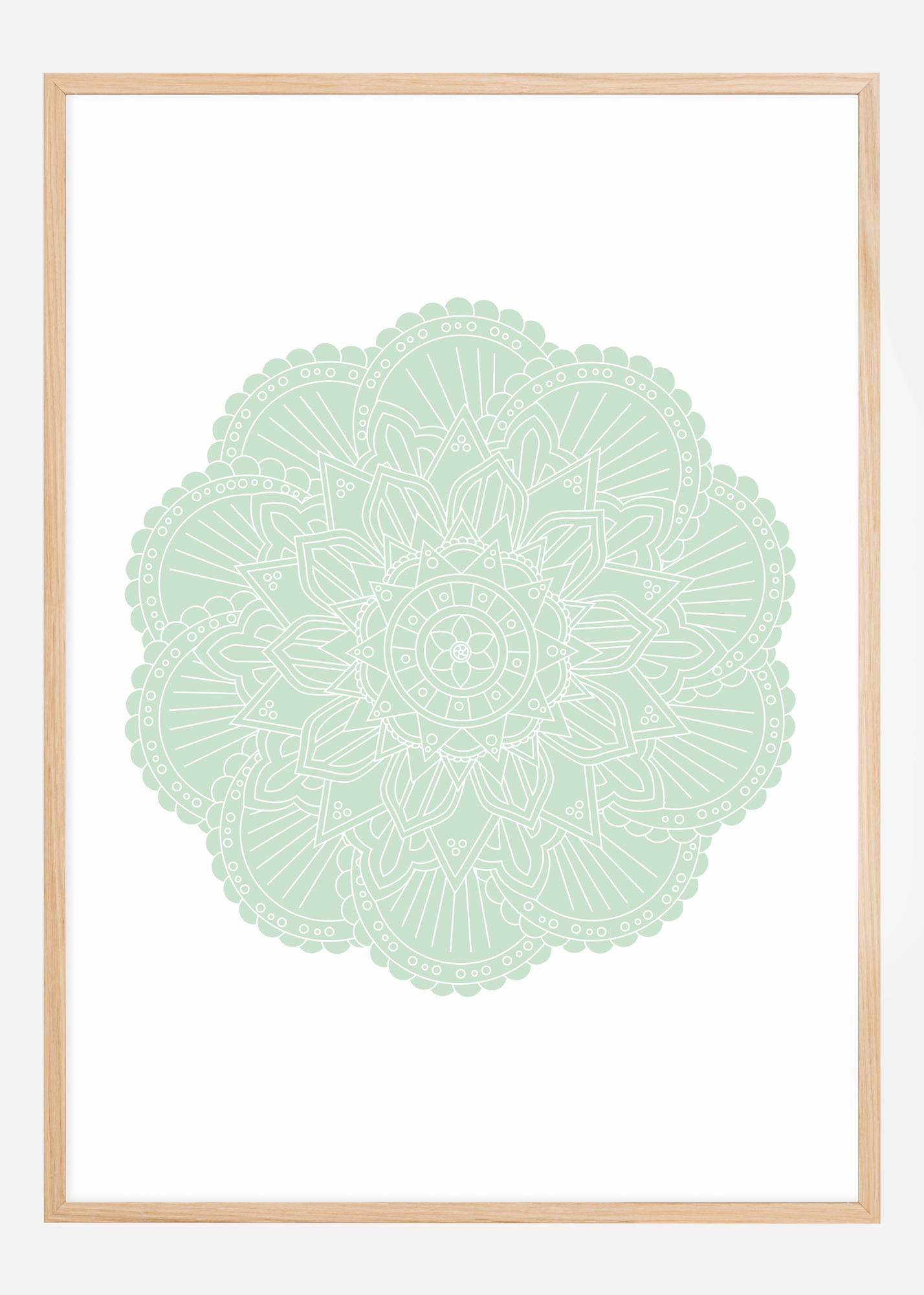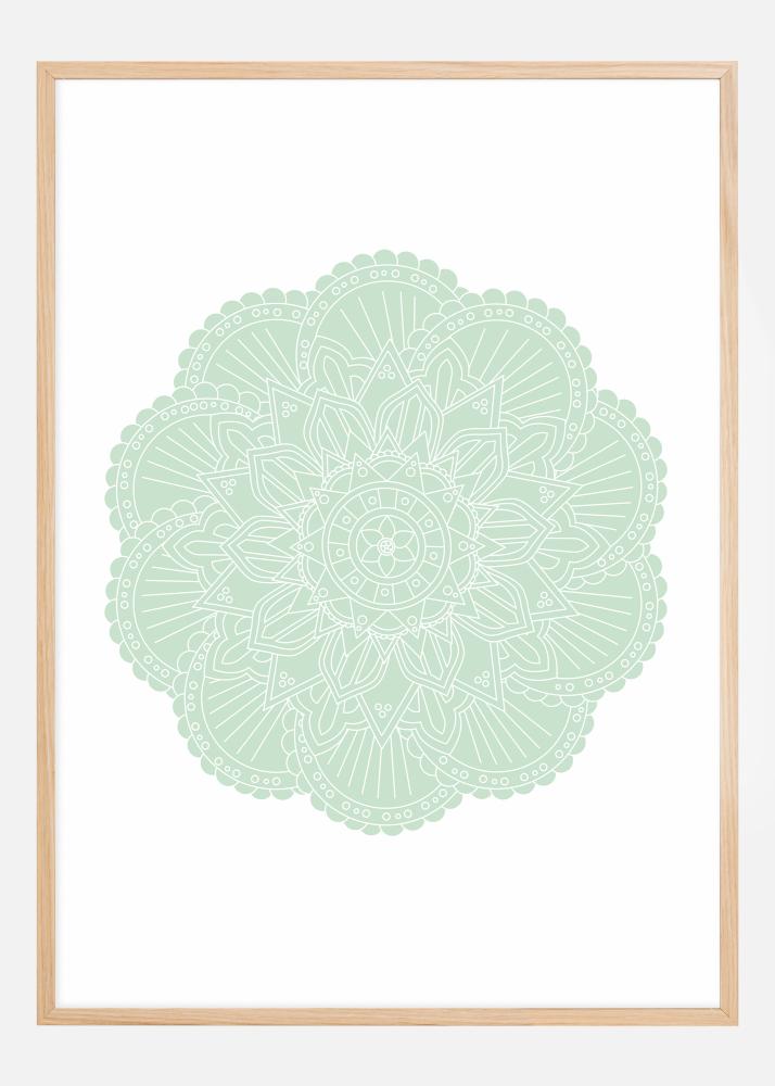 Този постер представя симетрична мандала в релаксиращи зелени нюанси, изображение, което е едновременно визуално привлекателно и символично богато. Мандалата, известна с използването си в медитация и релаксация, предлага сложен модел, който привлича окото да изследва и ума да се рее. Меките тонове допринасят за усещане за баланс и хармония, което прави това произведение на изкуството идеално за съзерцание и спокойствие.