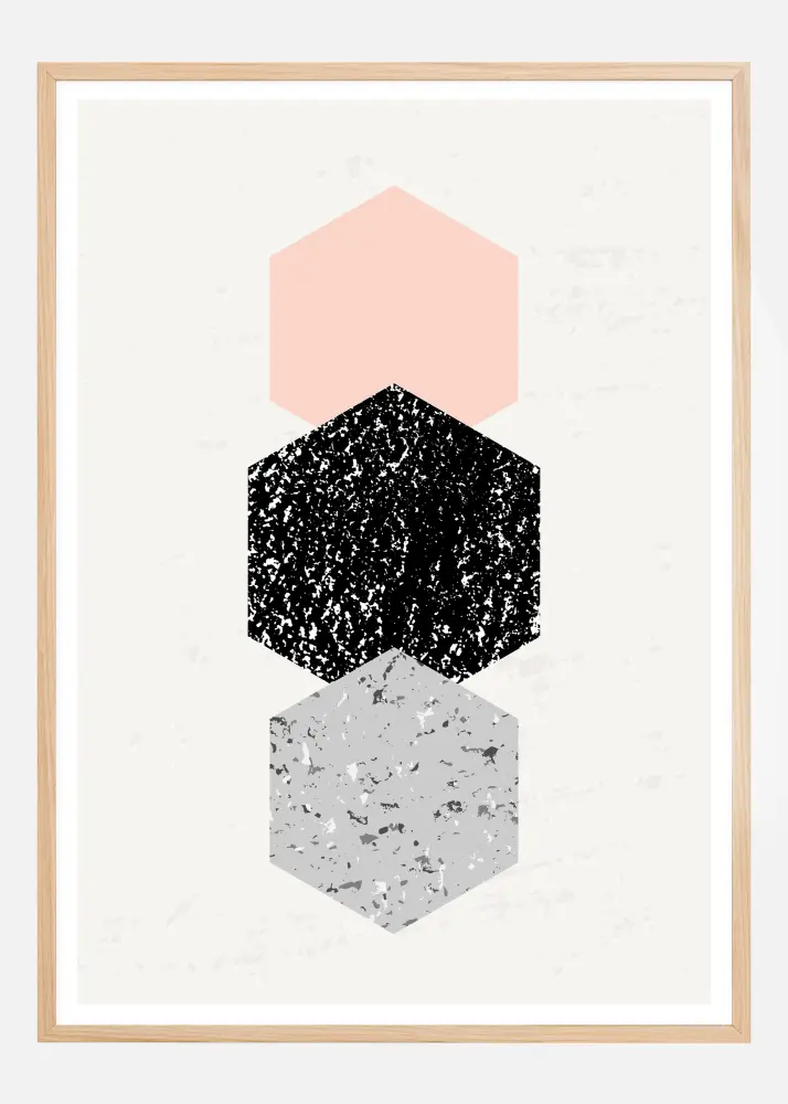 Абстрактен постер с шестоъгълници с три шестоъгълника един върху друг. Най-горният е в меко розово, по-големият в средата е черно-бял на петна, а долният е син мраморен шестоъгълник. Окото следва през това произведение, без разсейвания, идеално за домашен офис.