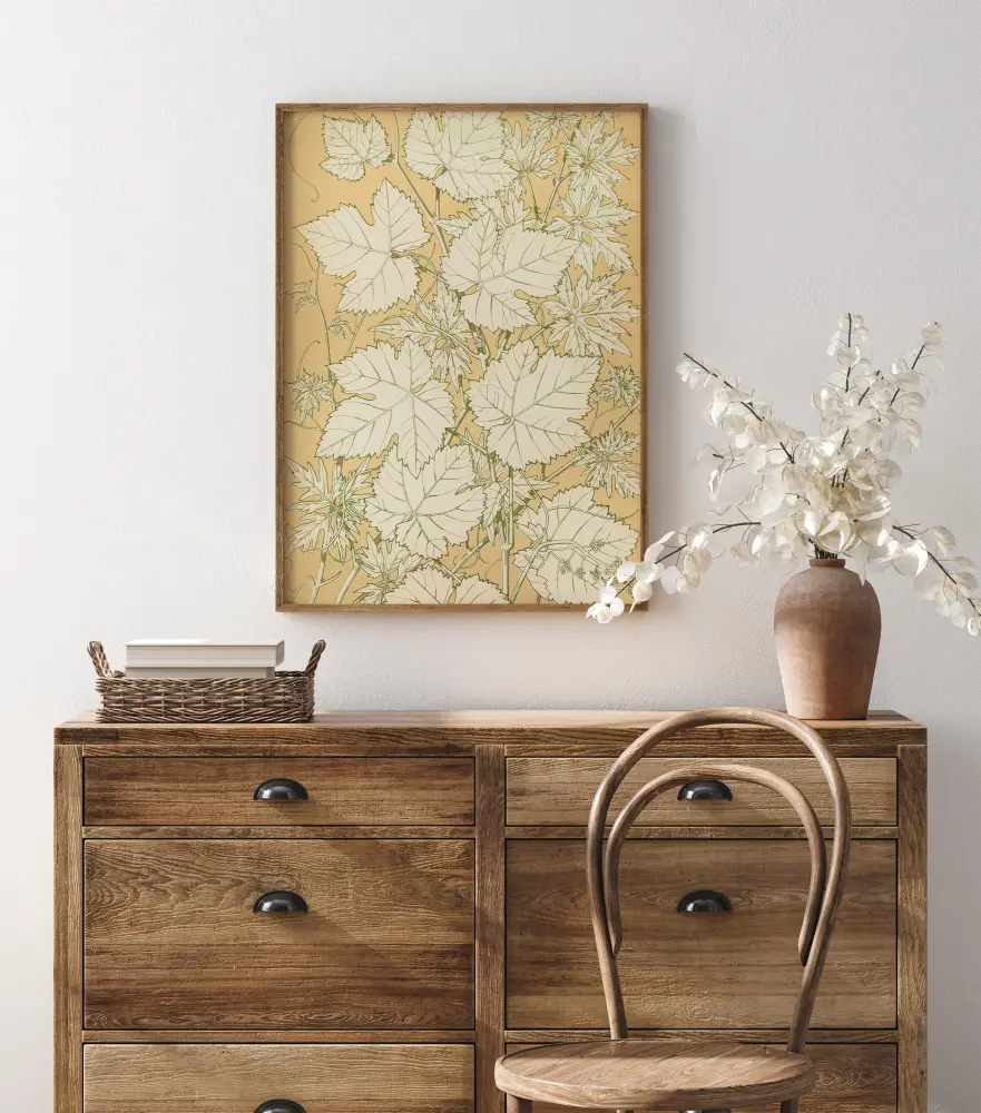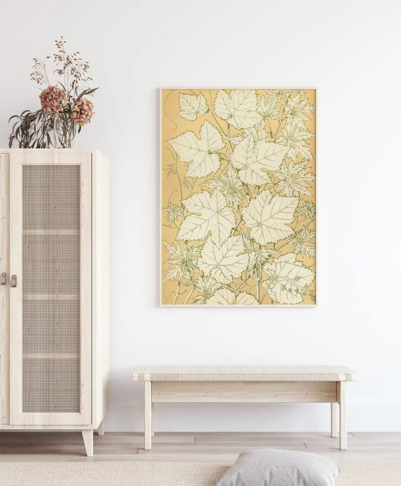 Постер от природата с листа на пастелнооранжев фон. Листата са нарисувани с черно мастило и без цвят, което ги кара да изпъкват като принт върху едноцветния фон. Освежете гладката стена у дома с това просто изкуство в печатен стил, когато внесете късче природа в дома.
