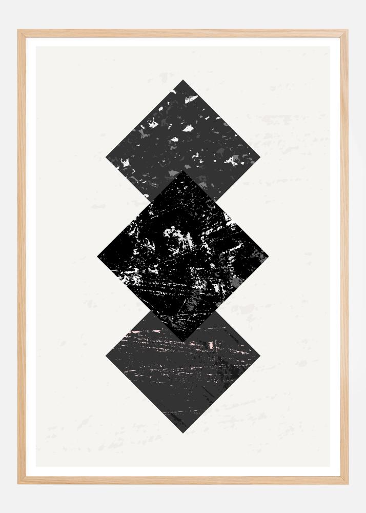 Геометричен постер с три тъмни квадрата, обърнати на върховете си. Два морскосини квадрата са разположени над и под по-голям черен квадрат. Всички са подчертани с бели точки и петна, за да се създаде интересен набор от модели. Съчетайте това произведение на изкуството със синя стена и нека формите изпъкват.