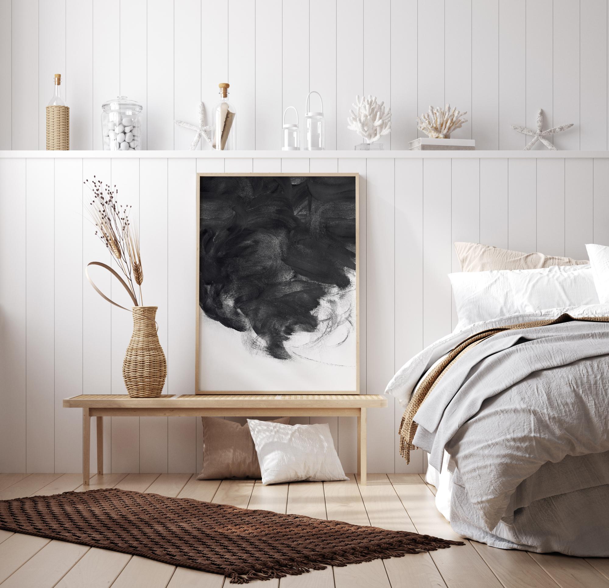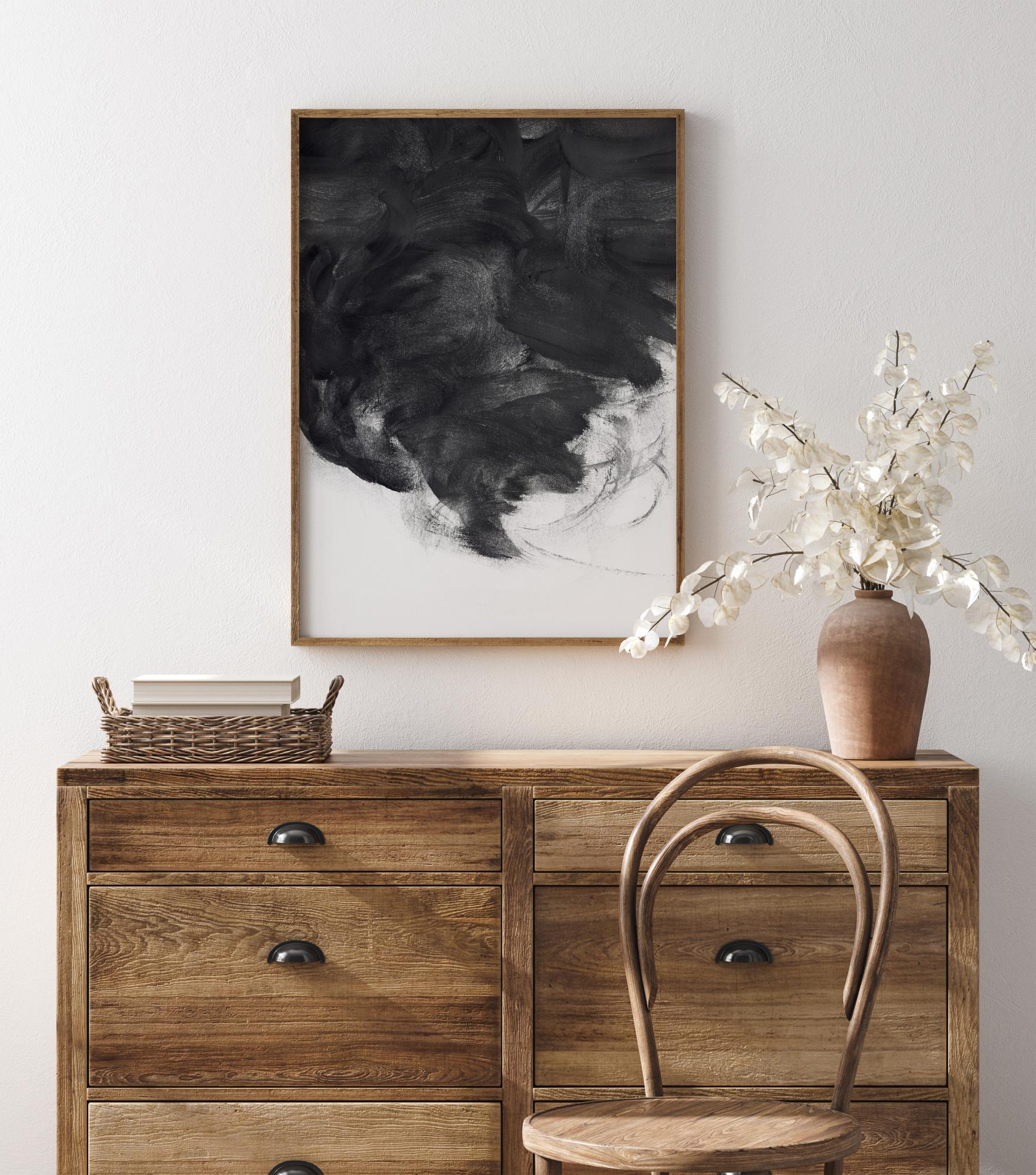 Абстрактен плакат на черна спирала. Това фантастично черно-бяло произведение води погледа от върха към средата чрез черната спирала. Там, където черно среща бяло, можете да си представите пещера, буря, гръмотевица или облак в този плакат, който е пълен с динамика. Поставете го на светла стена за драматично и епично усещане.