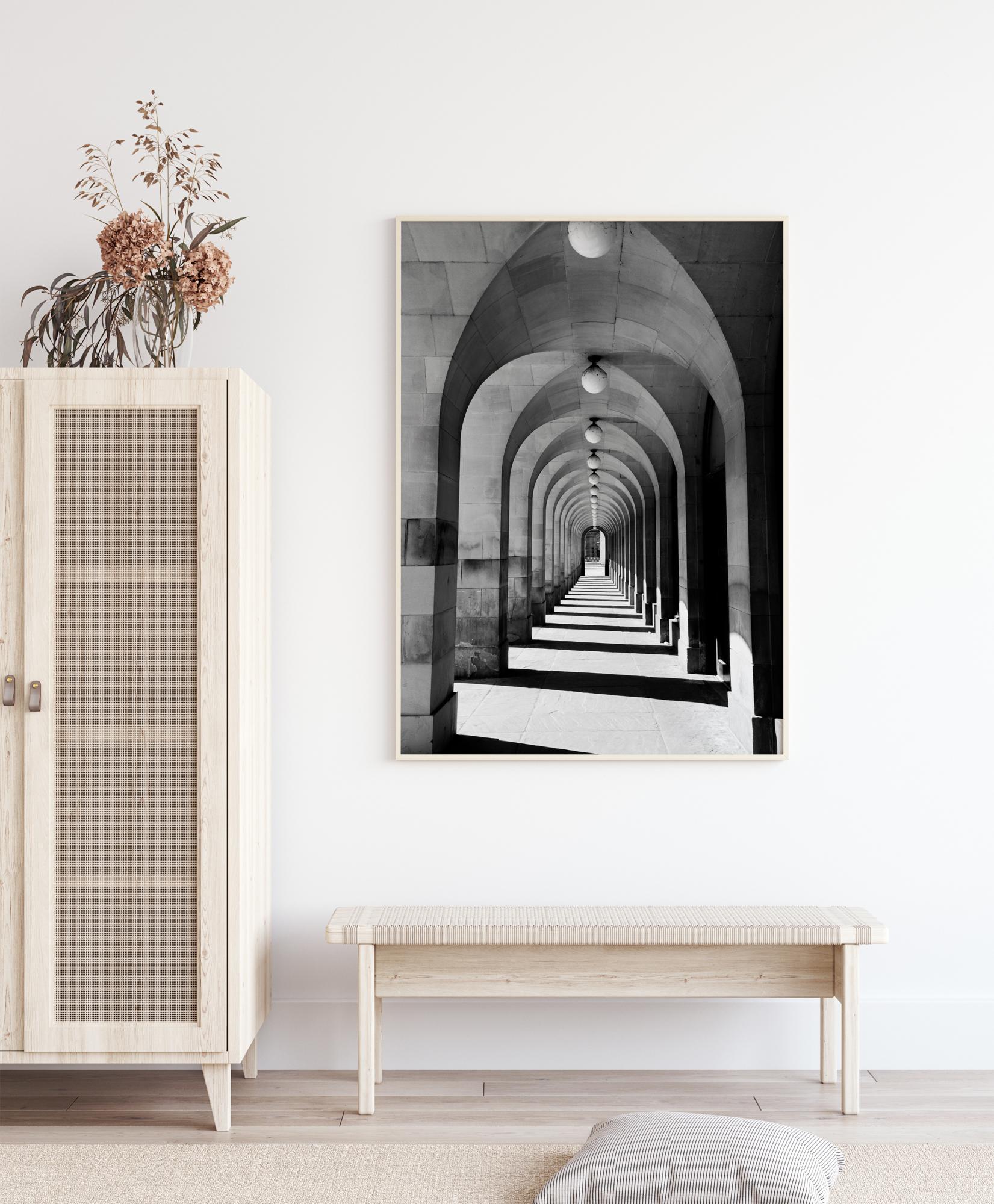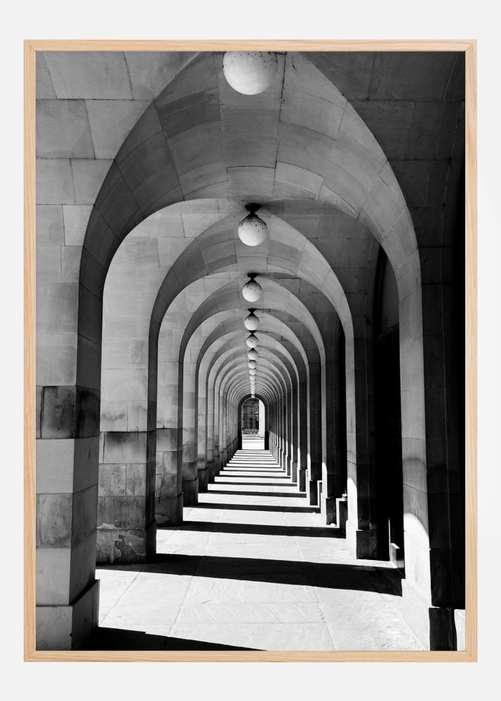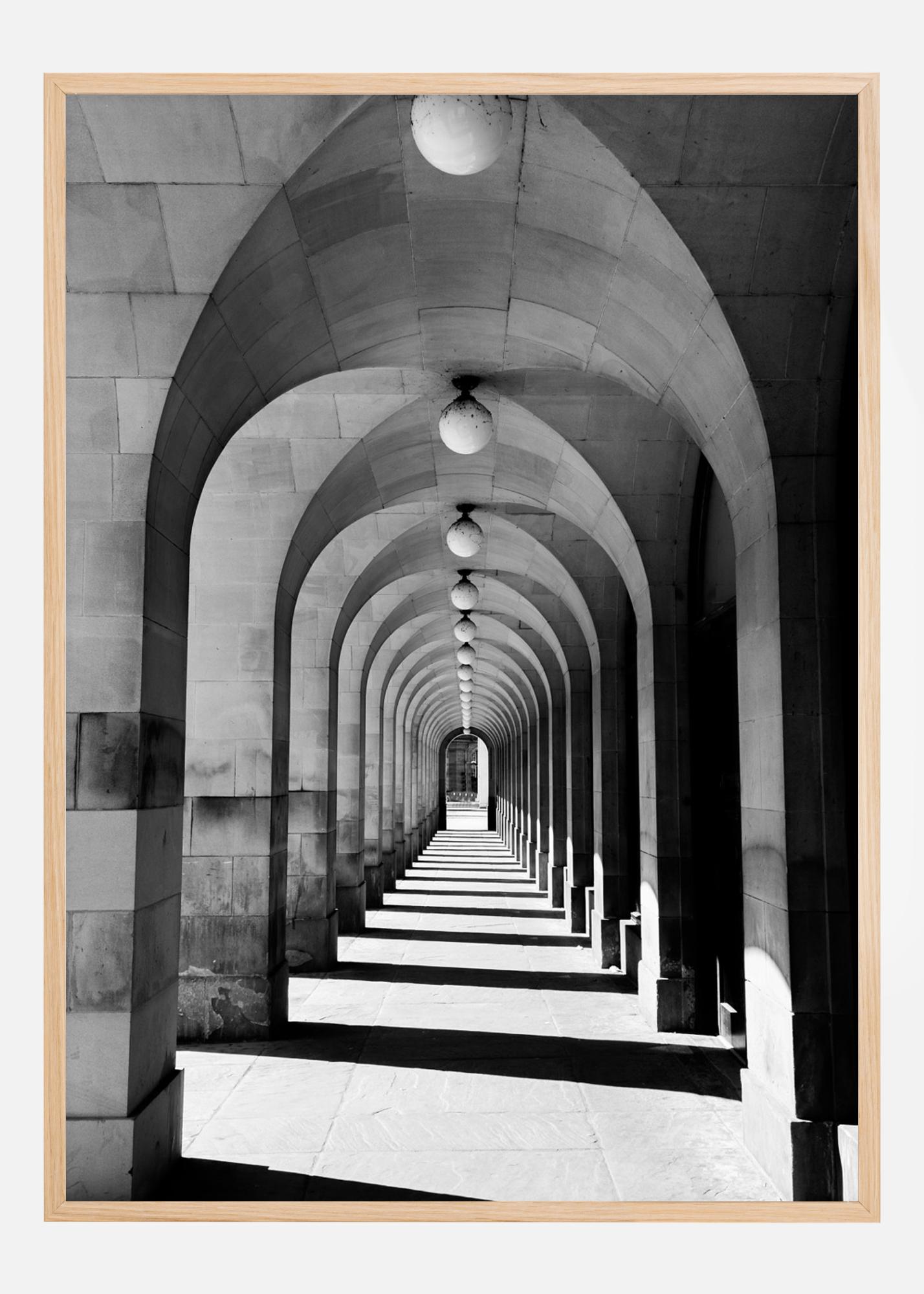 Интериорен постер на дълъг арковиден коридор. Всяка от арките води погледа надолу през коридора, който изчезва в далечината. Сивите тонове правят така, че сенките на всяка арка да изпъкват на светлината. Почувствайте как стаята става по-голяма, когато закачите този постер и следвате коридора с поглед.