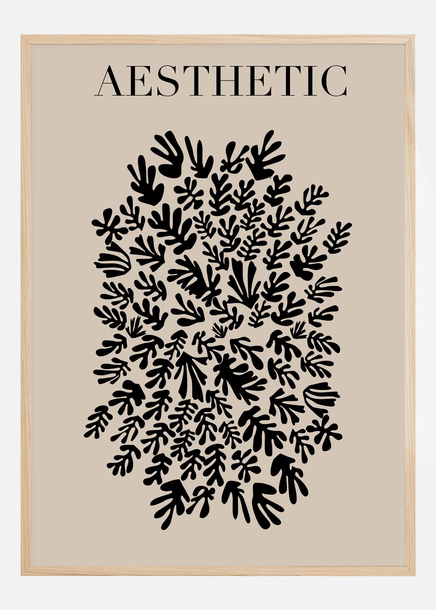 Със съвременния си израз и проста цветова палитра, ограничена до черно и бежово, този принт предава успокояващо и балансирано впечатление. Думата "AESTHETIC", поставена в горната част на мотива, служи като силно напомняне за вечната красота на дизайна и природата. Този афиш би се вписал отлично в интериор, където се стремите да създадете оазис на покой и вдъхновение, или като част от по-голяма стена с картини, за да създаде обединяващо визуално изживяване.