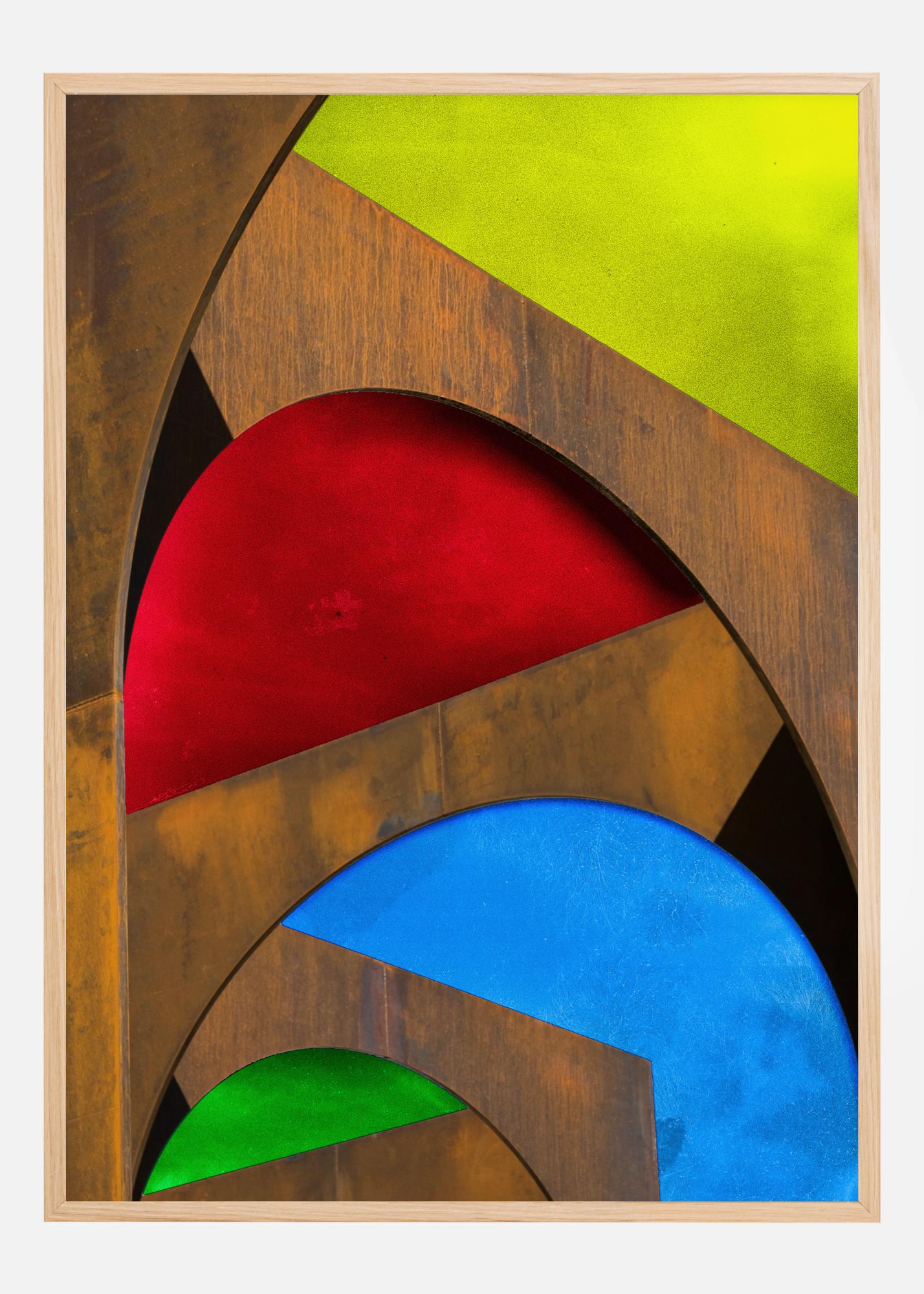 Светъл абстрактен постер с цветни форми. Основните цветове изпълват тази творба с червени, жълти и сини полукръгли форми. Тези форми са съединени с прави дървени резки към черно. Донесете живот на скучна и гладка стена или комбинирайте с друг съществуващ смел цвят, за да допълните творбата.