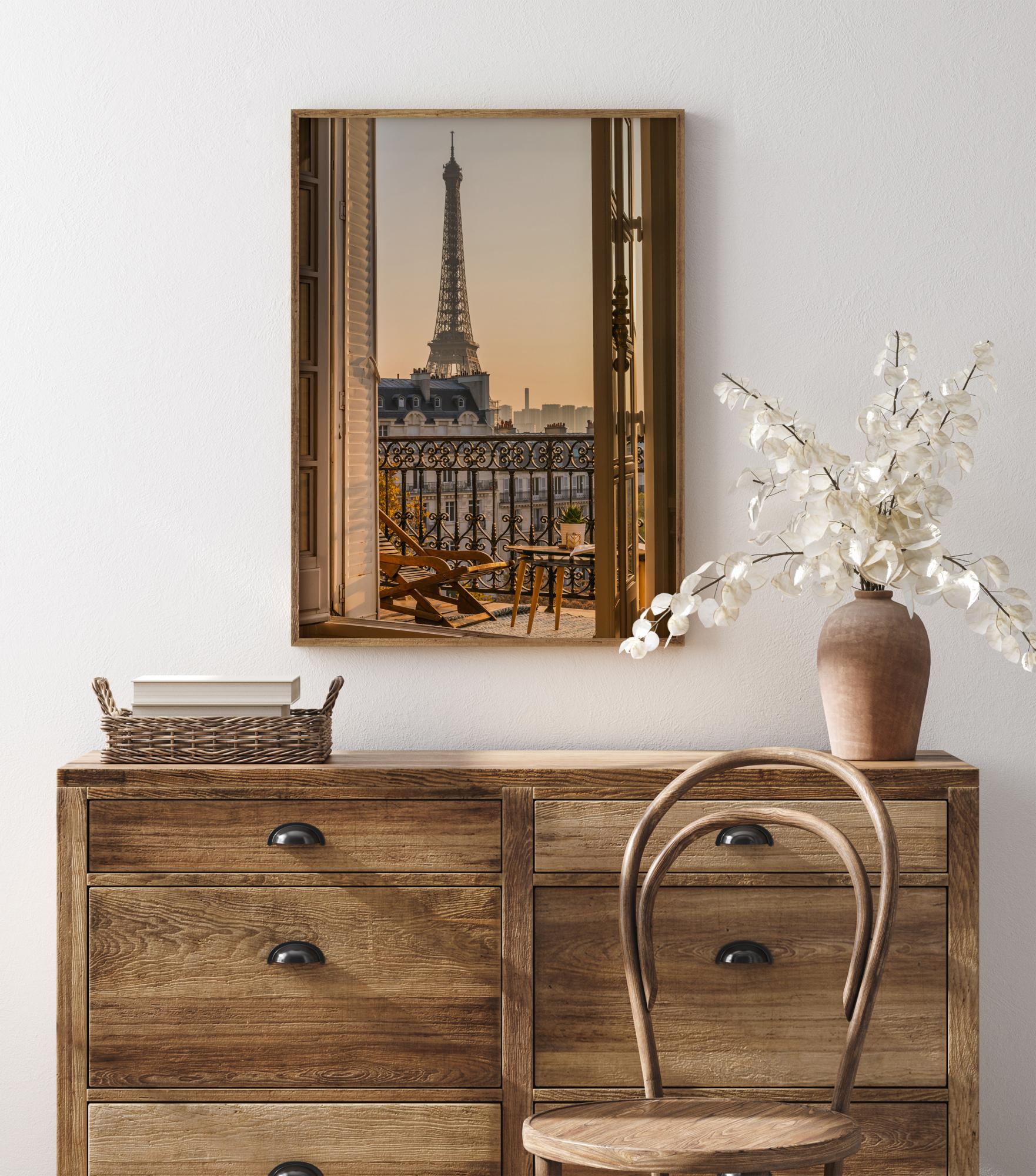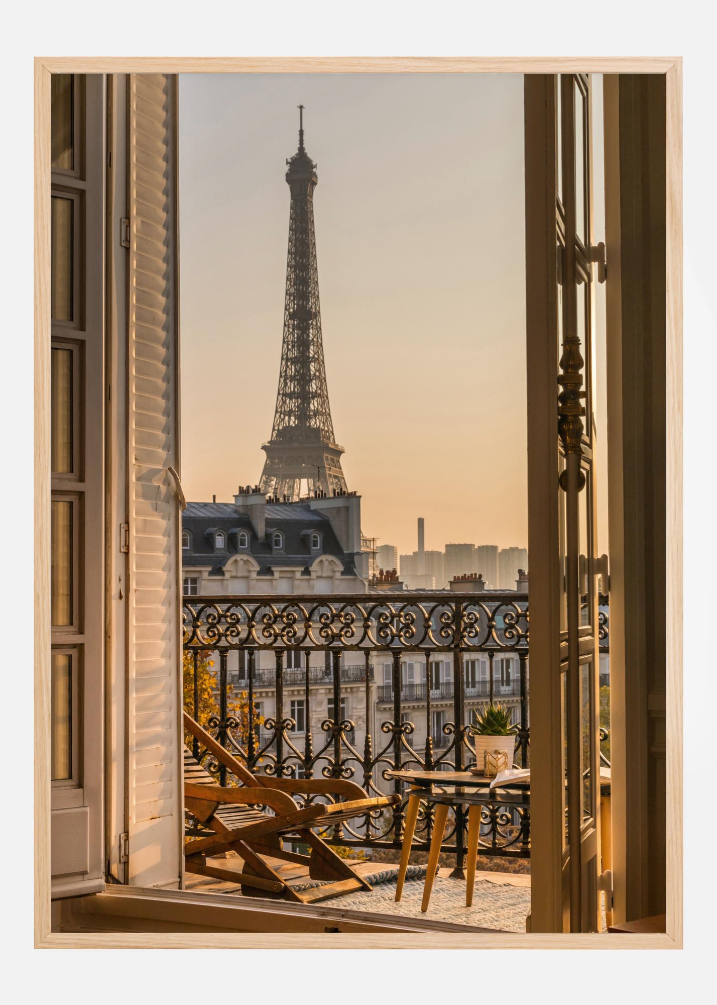 Един красив постер на градски пейзаж, показващ Айфеловата кула в далечината. Украсен балкон е мястото на тази картина с меко сутрешно осветление, което покрива стола и парапета. Кулата стои високо и привлича вниманието. Почти можете да усетите прохладния вятър през отворените врати.