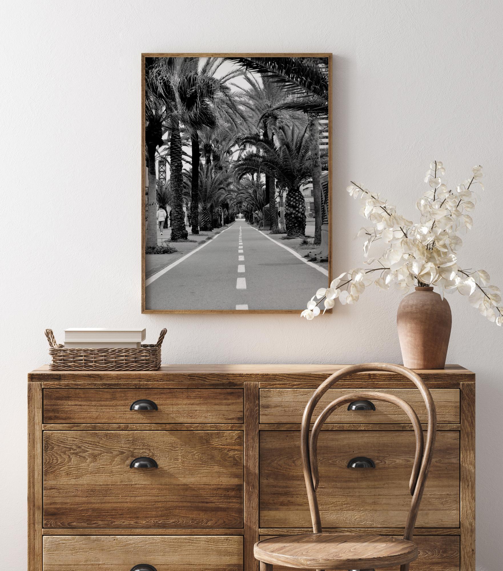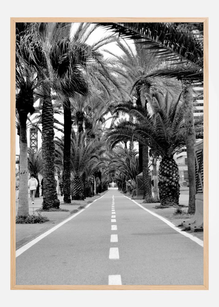 Постер на пейзаж с участък от път, който минава през горичка с палми. Палмите създават граница за пътя, докато белите линии водят далече в далечината. Дърветата образуват арка, която насочва погледа в нова посока. Поставете тази черно-бяла красота на стената за екзотично усещане.