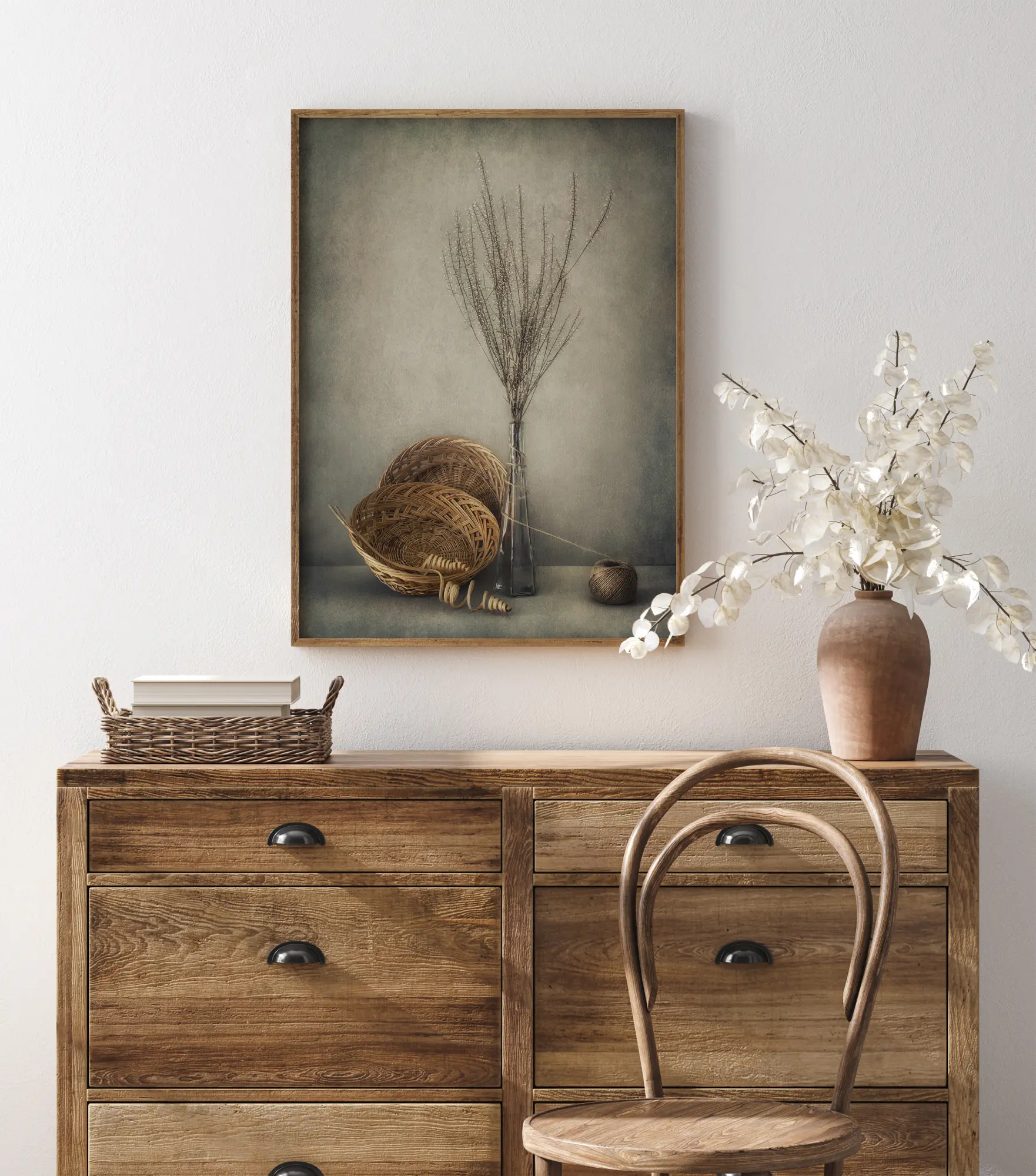 Натюрмортен плакат с кошници, глинена саксия и стъклена бутилка със суха трева. Този произведение има фини сепия и сиви тонове, които създават меко и хармонично произведение. Донесете малко спокойствие в дома си с този плакат и го комбинирайте с неутрална стена, за да не доминира твърде много.