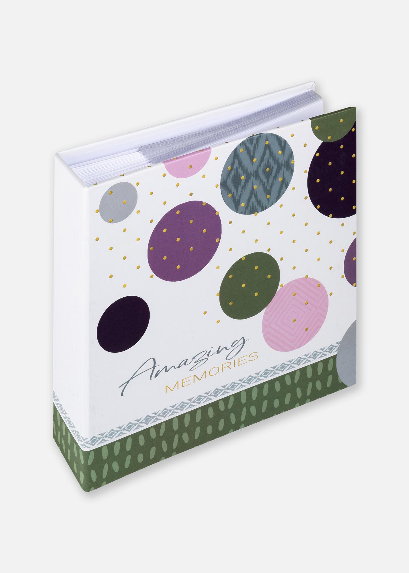 Радостните спомени заслужават радостно опаковане! Този фотоалбум има много декоративен и красив дизайн, който подхожда на вашите най-скъпи фото спомени. Предната страна на корицата е украсена с цветен десен, състоящ се, наред с други, от кръгове в различни цветове и размери, малки възхитителни златни точки – както и заглавието "Amazing memories".