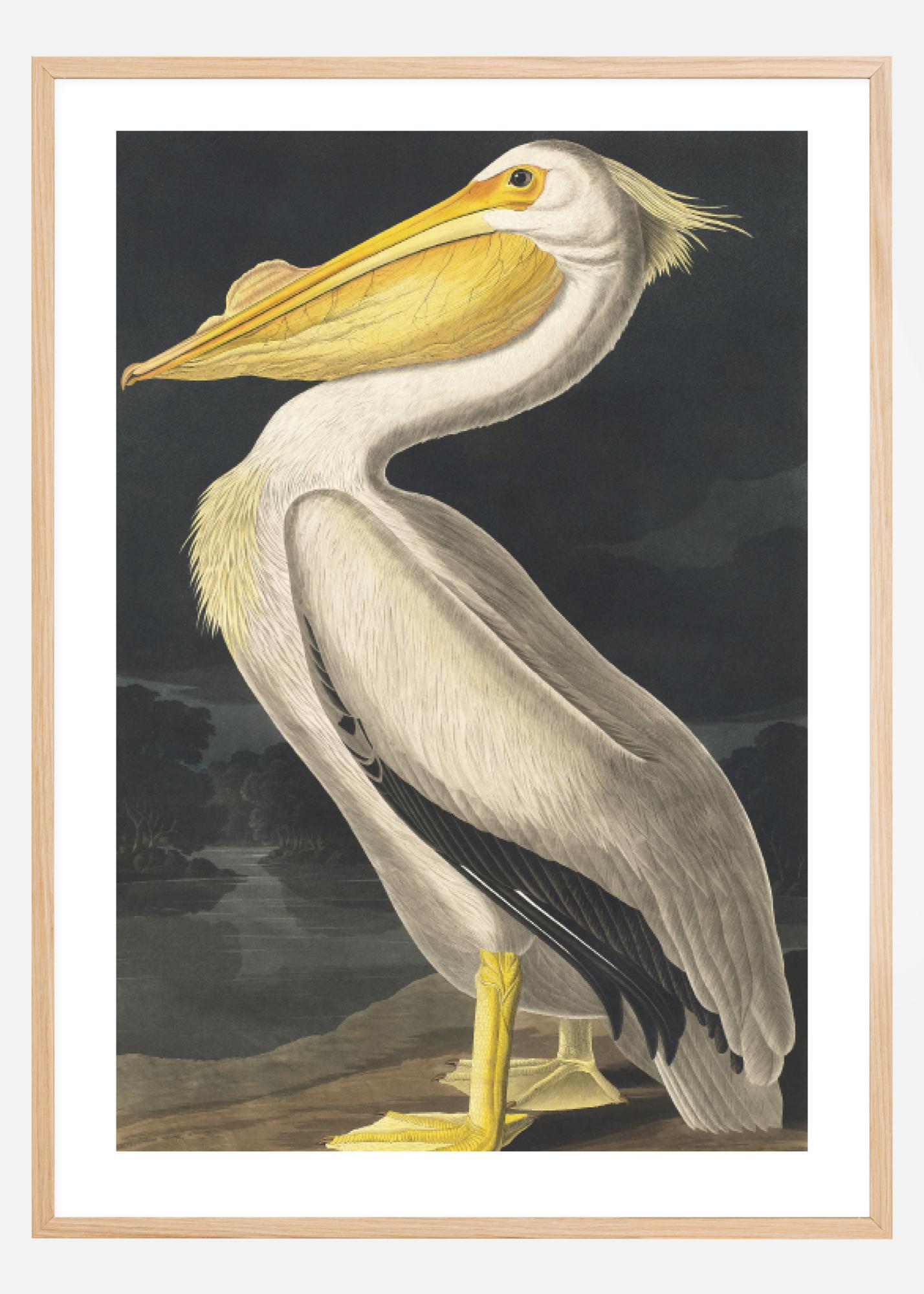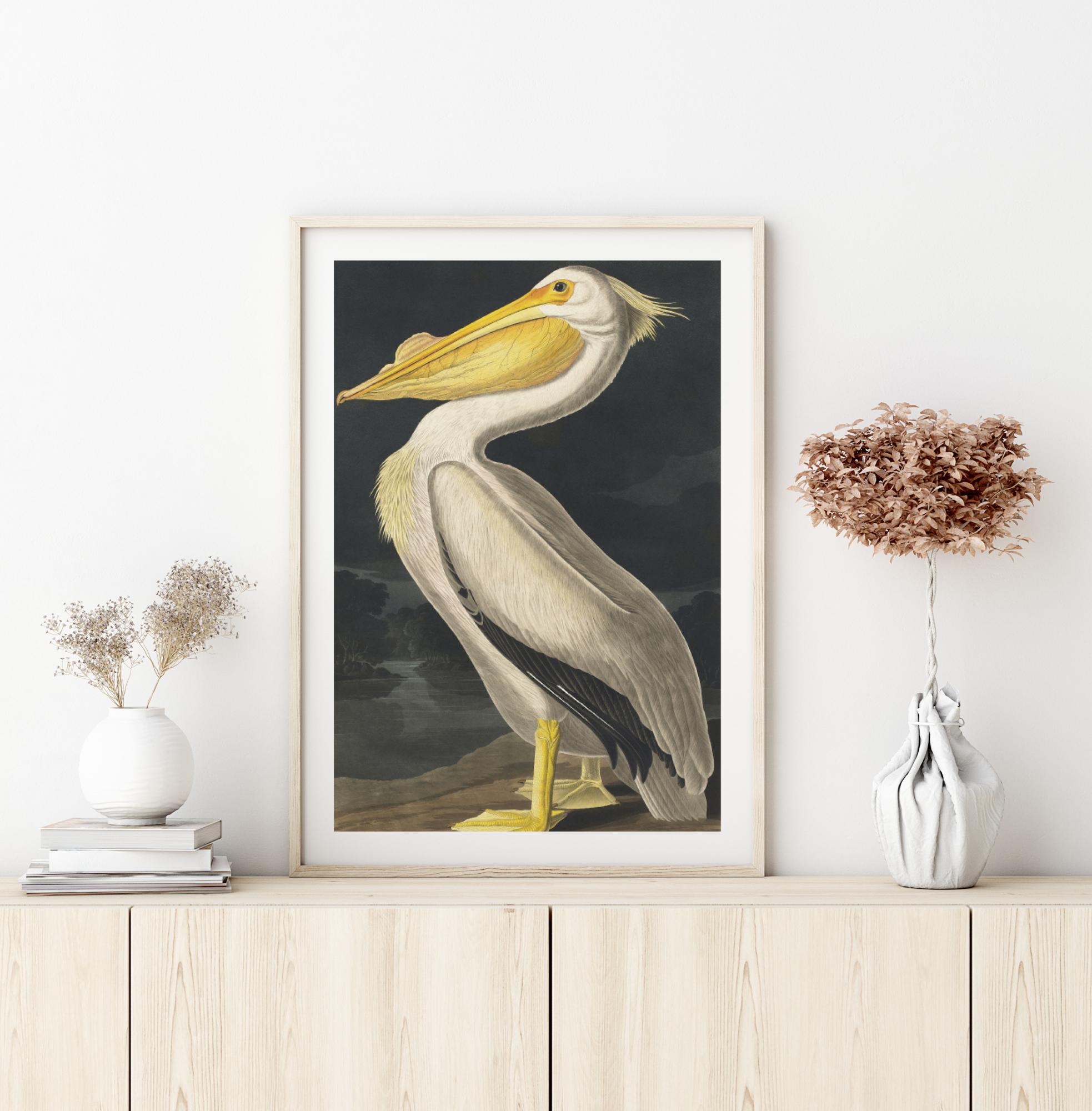 Плакат с природна тематика с рисуван пеликан. Тук птицата седи високо и гордо с масивния жълт клюн към гърдите си. Изразителните жълти крака и бялата гръд са в остър контраст с тъмния, приглушен пейзаж зад нея. Пренесете усещане за антични картини, когато купувате тази невероятна картина.