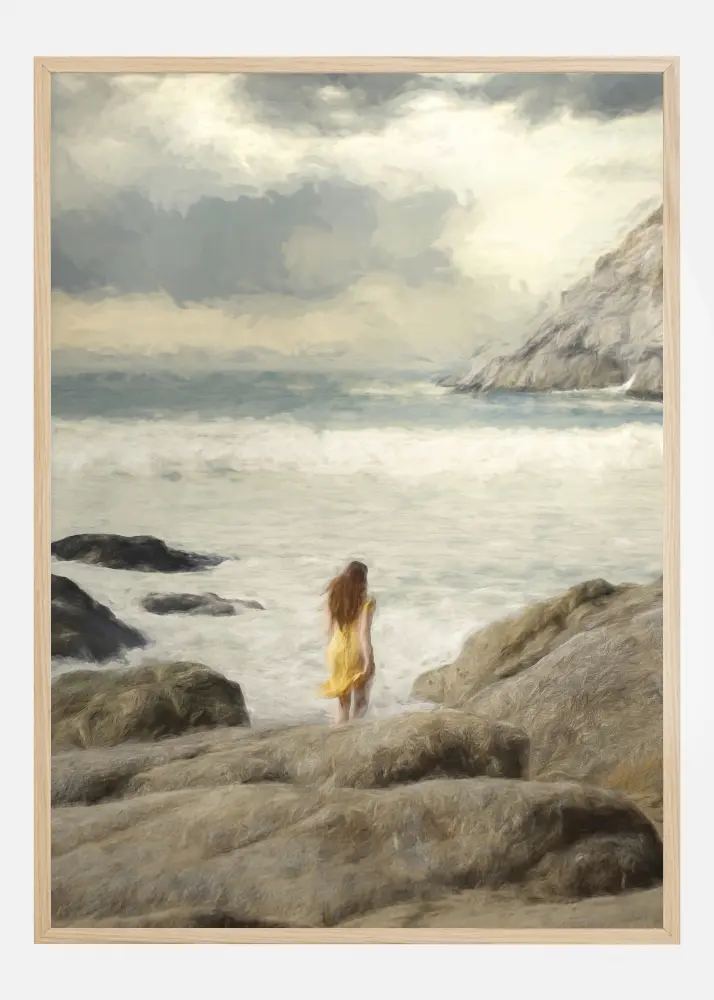 Укротете ума си и се оставете да бъдете погълнати от едно място на спокойствие с нашия завладяващ постер, посветен на вечния ритъм на морето и тихите разговори на природата. Този принт изобразява младо момиче в златна рокля, наблюдаващо бурното море от безопасността на скалите. Червената ѝ коса се вее в бриза и хармонично се слива с меките щрихи на пейзажа, създавайки усещането за картина, а не за фотография.