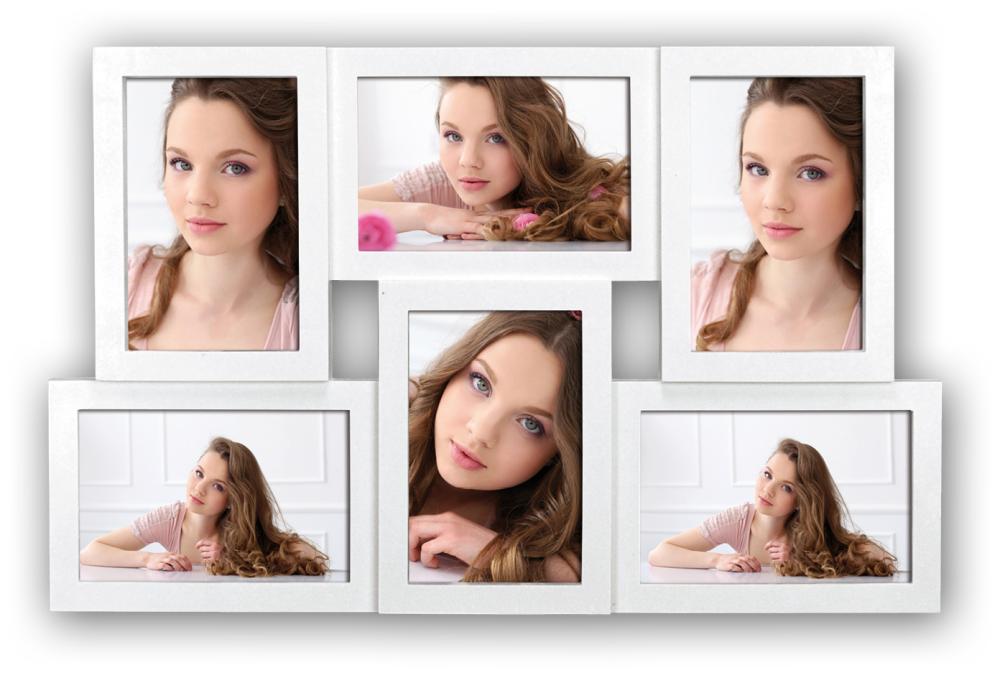 Модерна бяла колажна рамка с място за 6 снимки както в хоризонтален, така и във вертикален формат. Перфектна, когато искате да създадете личен фотоколаж за закачане на стената.