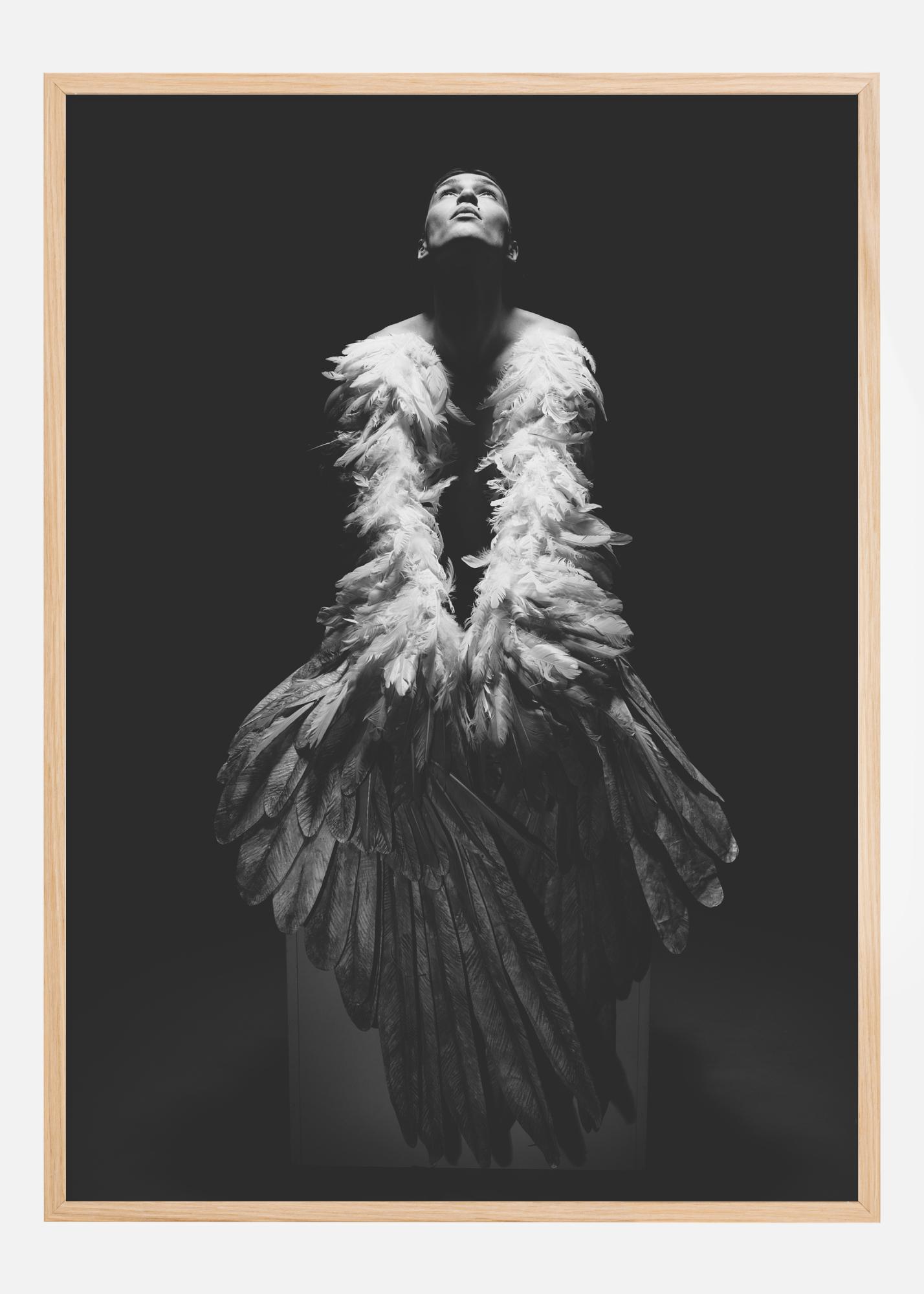 Портретен постер на мъж в дълъг перален костюм, за да имитира летене във въздуха. Той стои на черен фон и гледа нагоре към небето. Прожектор свети отгоре, подчертавайки лицето и раменете му, така че автоматично да се фокусирате върху него, когато погледнете това драматично произведение.