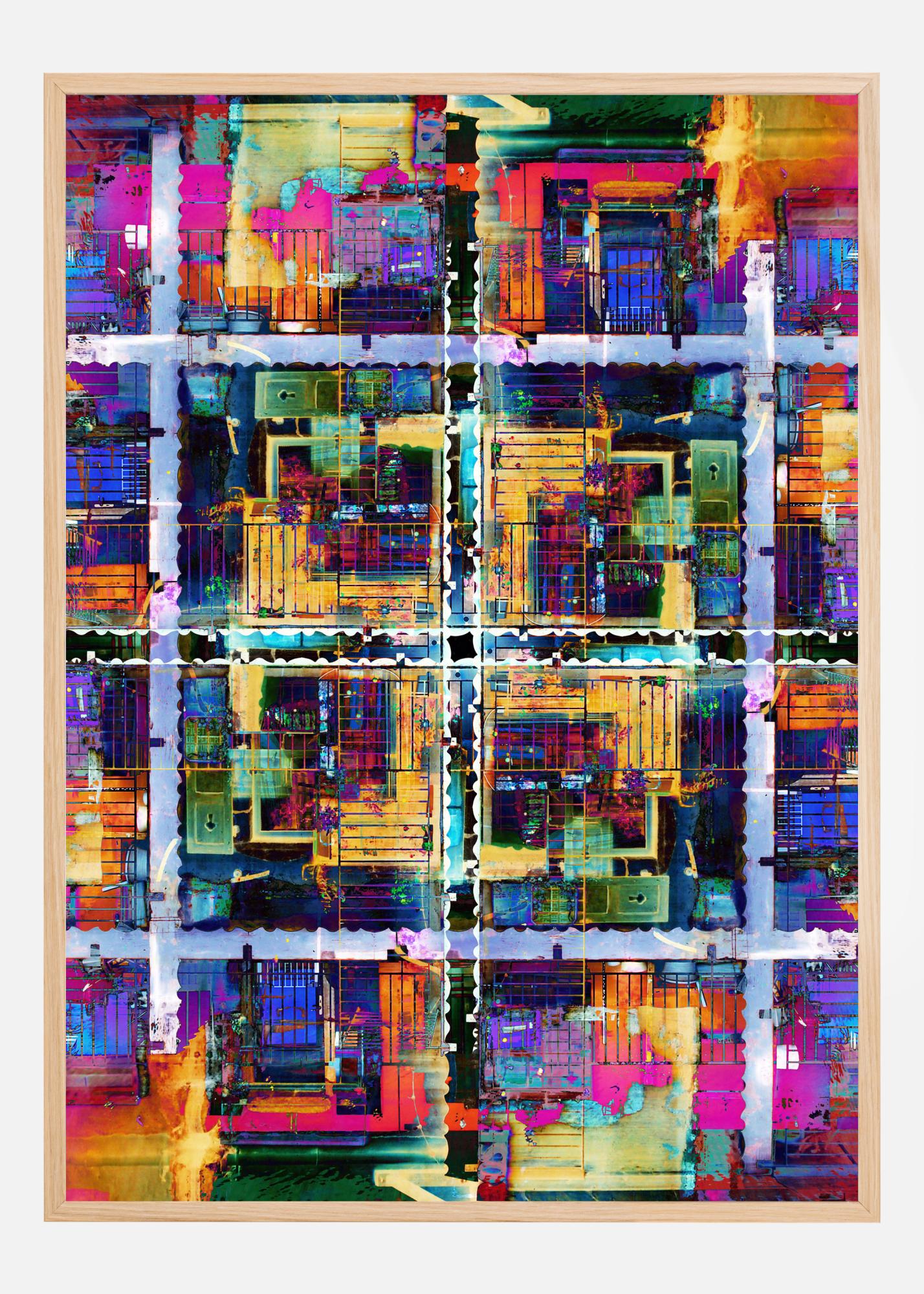 Неонен плакат, пълен с абстрактни шарки. Като спектър от цветове, подобен на петно от масло, тази картина прилича на напречно сечение на различни пространства. Всяко квадратче е изпълнено с множество цветове, което прави това едно завладяващо произведение, което можете да разглеждате с часове - най-добре е да го поставите на неутрална стена.
