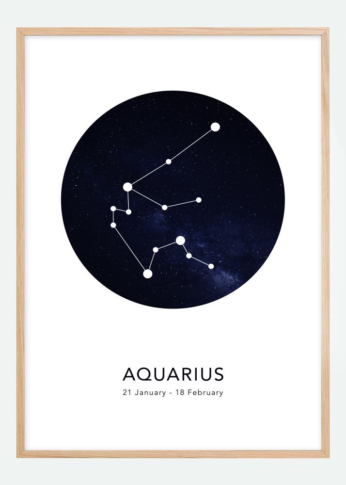 Подарете персонализирана картина на някой, който харесвате! Този стилен постер има изображение на зодиакалния знак Водолей на фона на черно и синьо звездно небе. Отдолу е името заедно с съответната дата на английски.