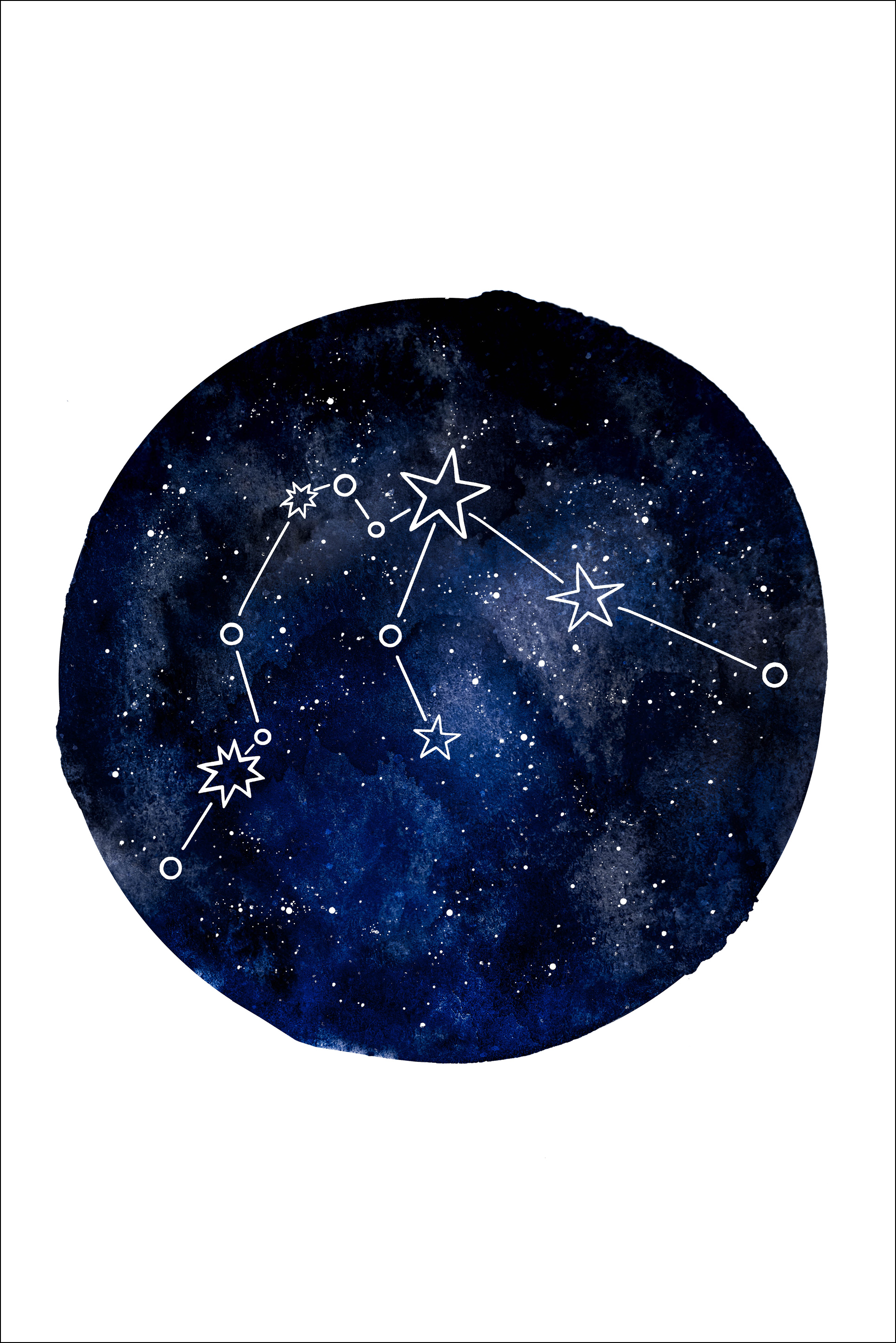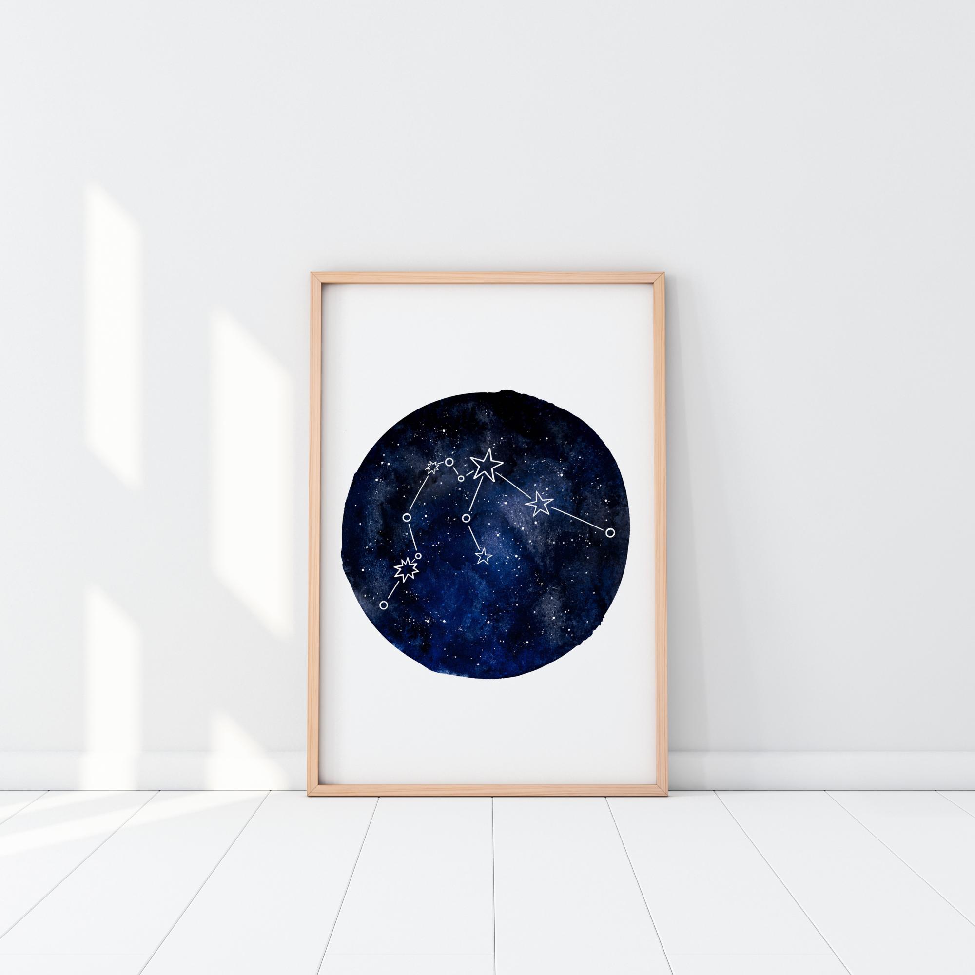 Абстрактен постер с астрологичния знак Водолей. Окачен тъмносин глобус с изображение на галактиката, което подчертава знака. Глобусът върви срещу прост бял фон. Закачете го на която и да е стена вкъщи, за да можете да видите знака на нощното небе.