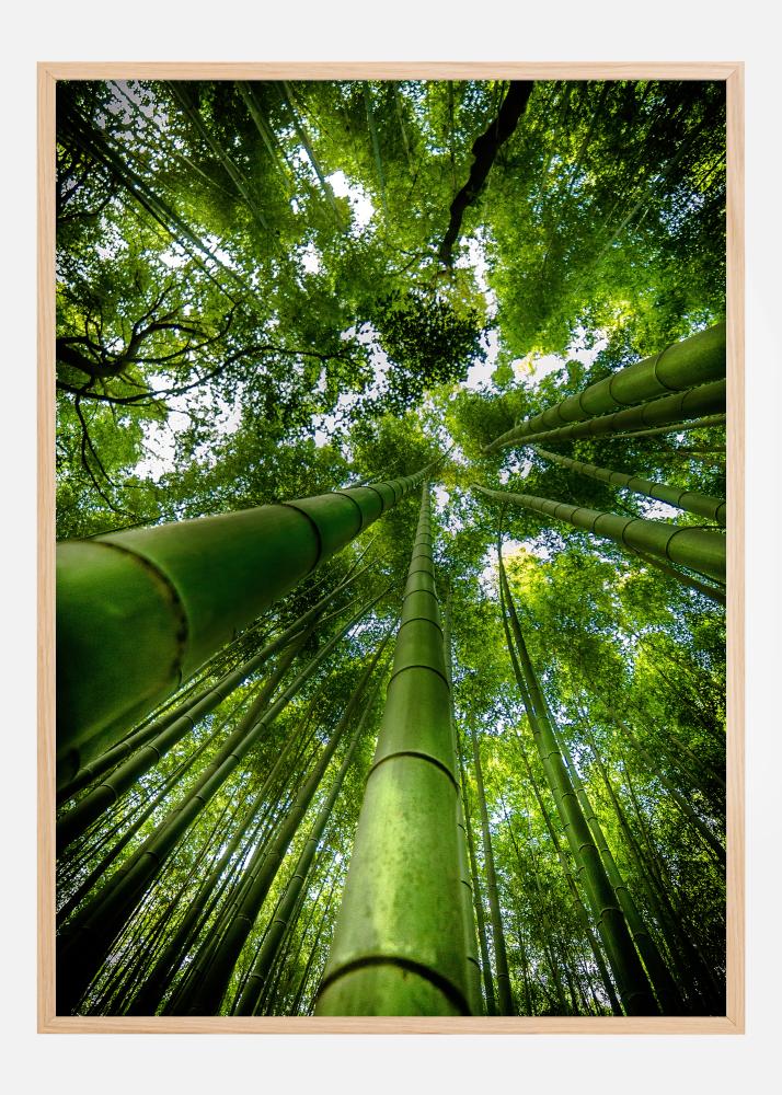 Плакат с природен мотив с зелени бамбукови растения. Погледнете към небето, когато тази картина е заобиколена от дебели стъбла бамбук, които водят към зеления покрив от листа в небето. Представете си, че лежите в този спокоен джунглов свят, когато поставите тази картина в дома си.