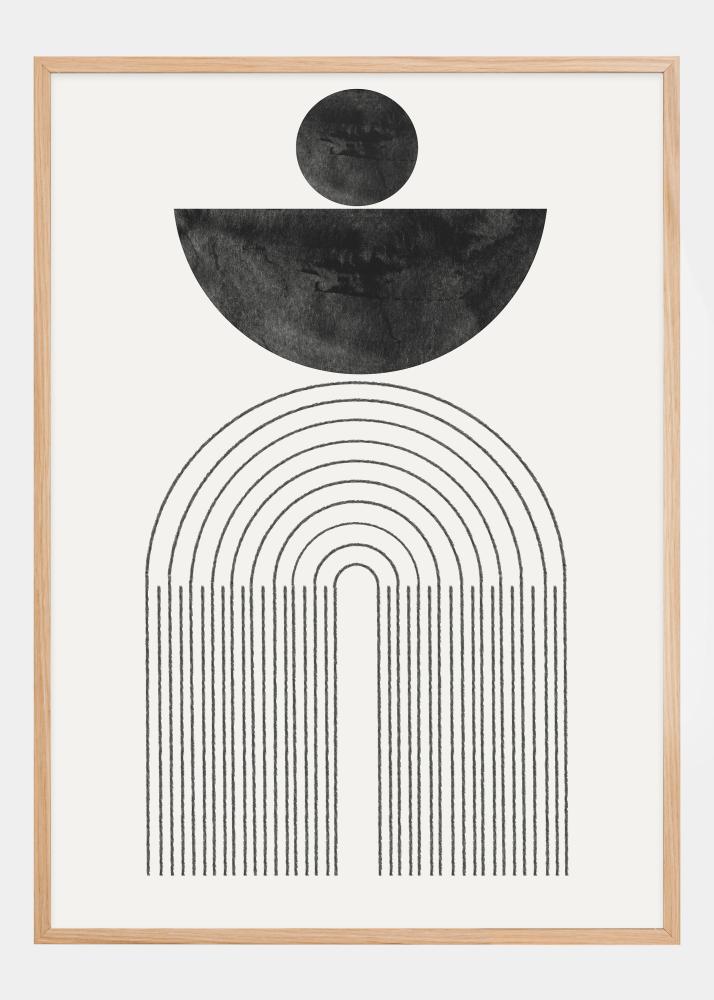 Този смел и внушителен постер е стилно тълкуване на лунните цикли и хармонията на небесните тела. Черната полукръг и пълният кръг отгоре илюстрират различните фази на луната, докато извиващите се линии отдолу наподобяват архитектурни колони или портали към друго измерение. Черно-белият контраст на произведението на изкуството придава усещане за елегантност и мистика, която обогатява всяка стая.