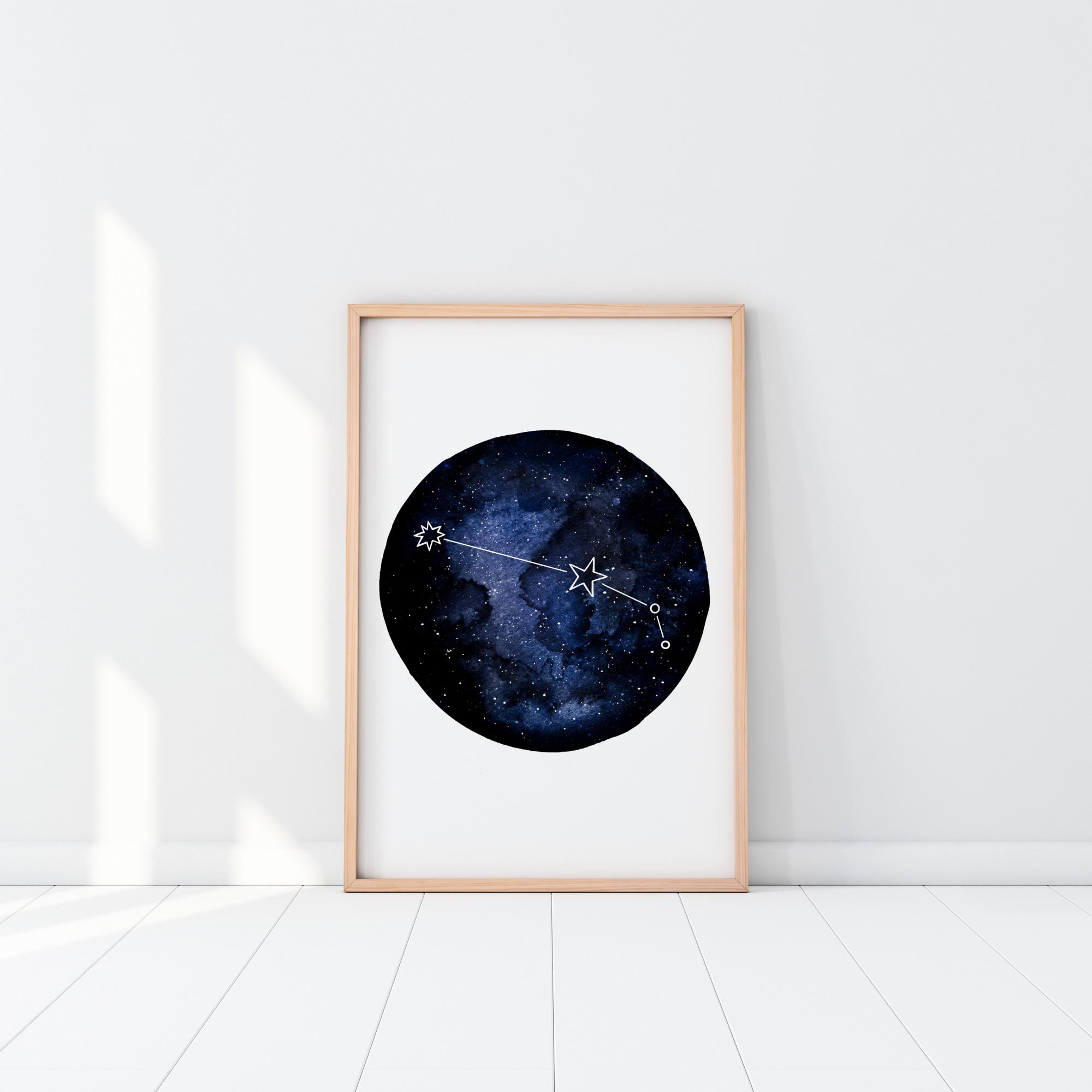 Абстрактен постер на зодиакалния знак Овен. Висящ тъмносин глобус с изображение на галактика и контур на зодиакалния знак. Глобусът се поставя на обикновен бял фон. Окачете го на стената в дома си и вижте дали можете да откриете този зодиакален знак на нощното небе.
