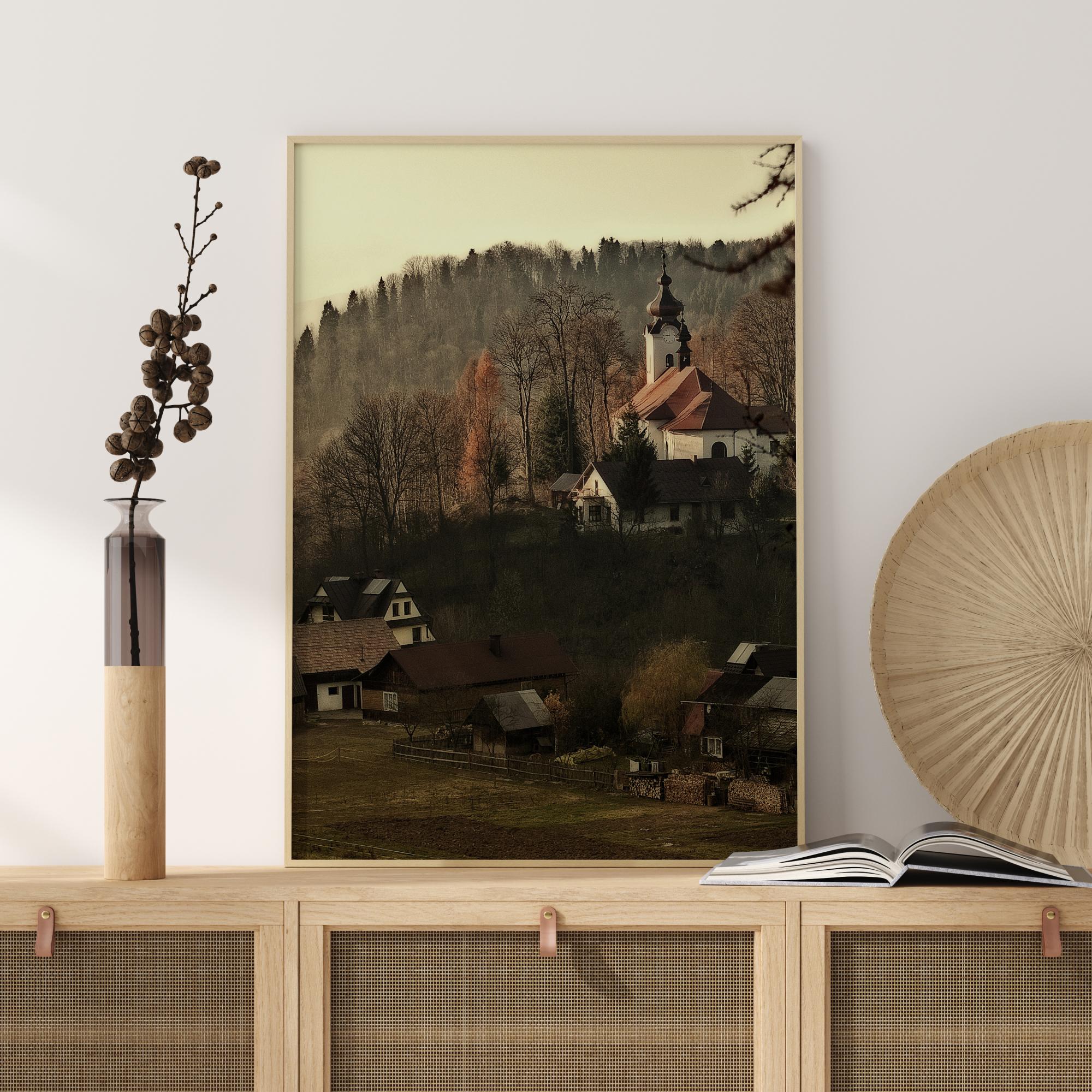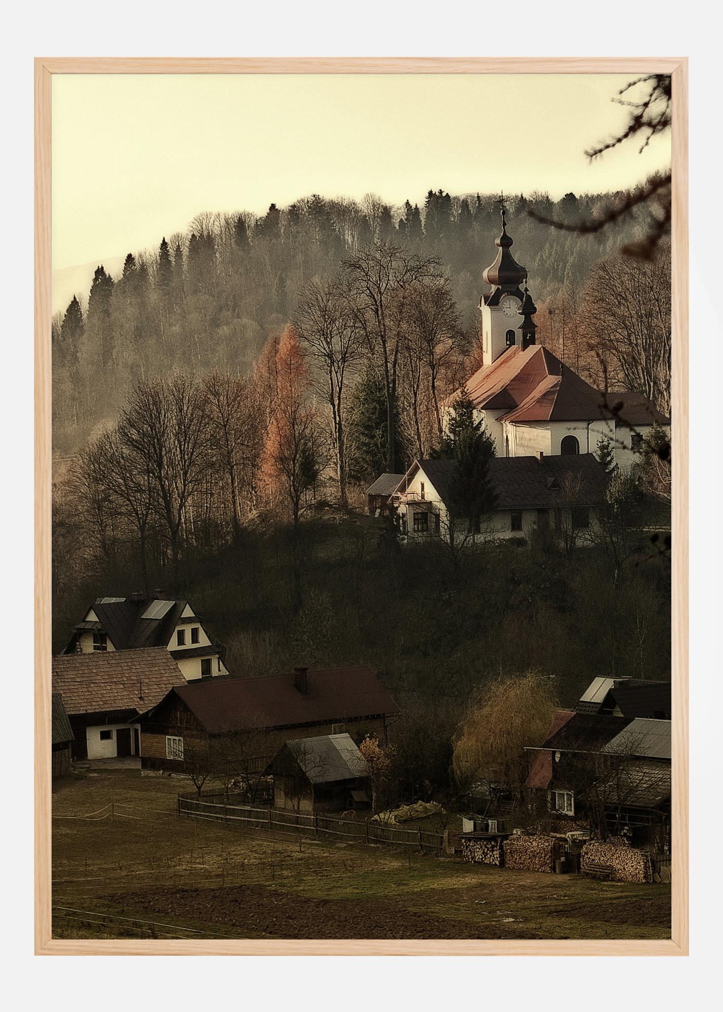 Плакат с градски пейзаж на малко село на село със стари къщи и полета с гористи хълмове отзад. Бяла камбанария се извисява високо срещу приглушените кафяви и зелени цветове на пейзажа. Потопете се в себе си и вашето въображение с помощта на това живописно село, когато закачите постера на стената.