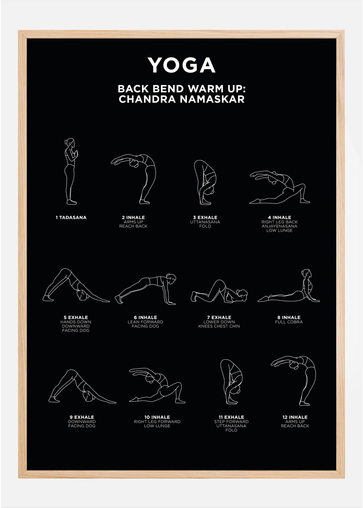 Плакатът е стилен с изчистен дизайн, но също така служи като помощна ръка, когато искате да научите едно от класическите йога упражнения за загряване ”Chandra Namaskar”. Плакатът се предлага в черно или бяло и в редица различни размери.