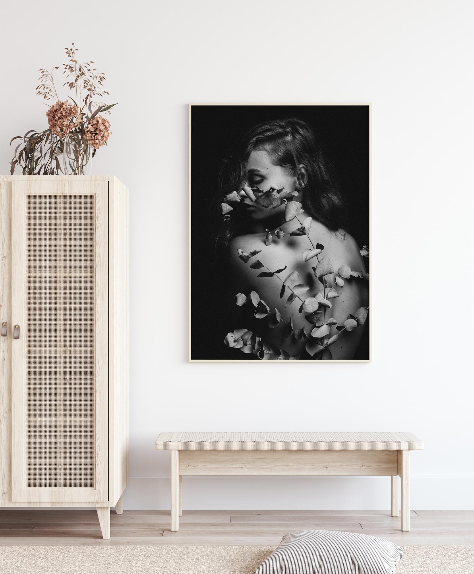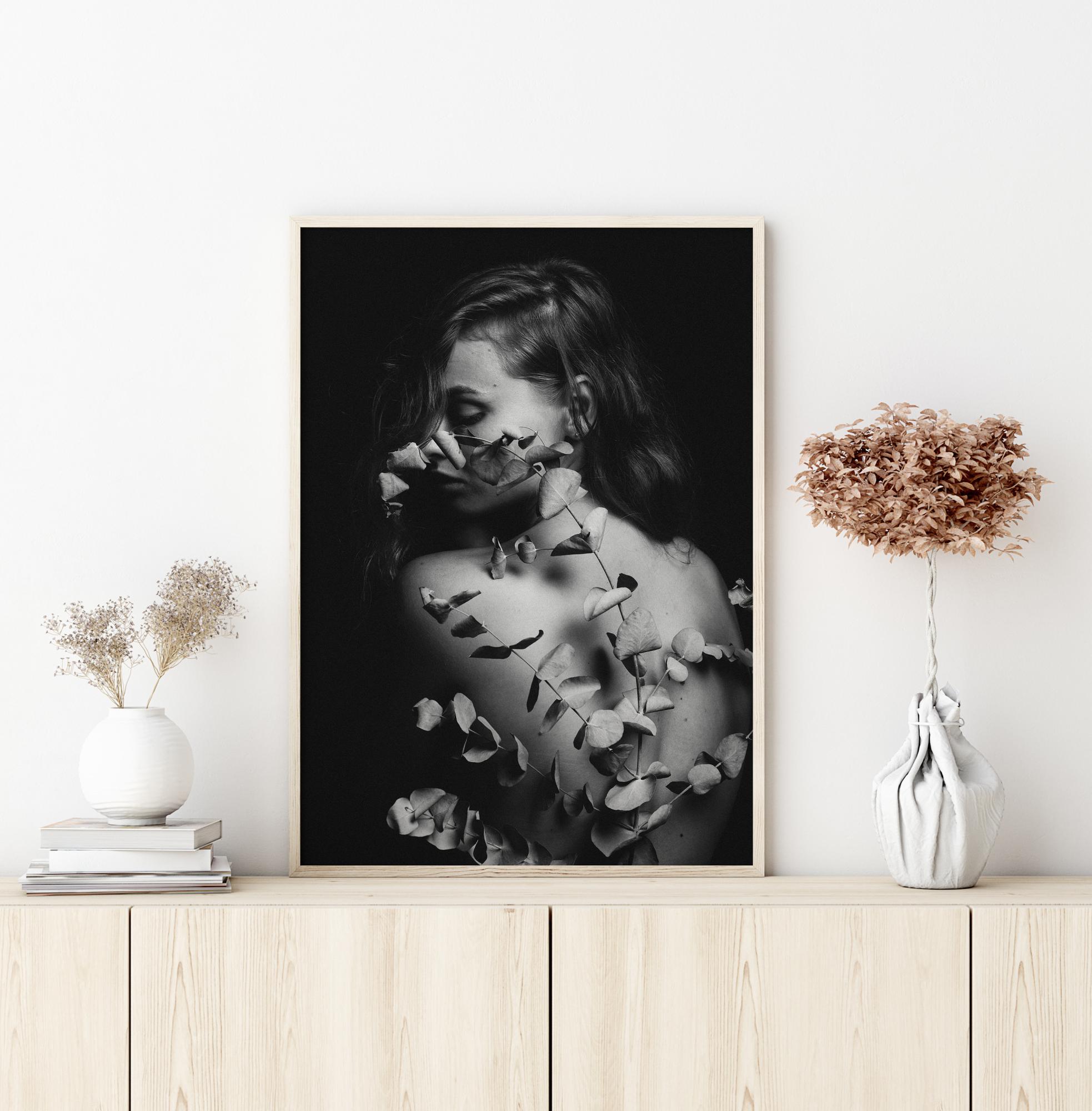 Един красив постер на жена с листа на гърба. Съчетайте тази черно-бяла картина с жив цвят на стената, за да постигнете драматичен ефект. Почувствайте мистиката и спокойствието и я вземете със себе си у дома.