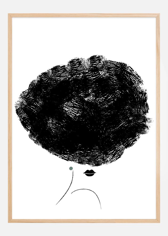 Този концептуален постер изобразява минималистичен, но изразителен женски профил, където нейната голяма, обемна коса доминира сцената. Косата, изобразена с мощни и дебели четки в черно, създава драматичен контраст с бялата фонова и предава усещане за динамично движение, уловено в тих момент. Малка, дискретна зелена точка, поставена при ухото, разбива монохроматиката и добавя лек цветен акцент. Този печат подчертава същественото във формата и цвета и предлага смела, модерна естетика за всяко съвременно пространство.