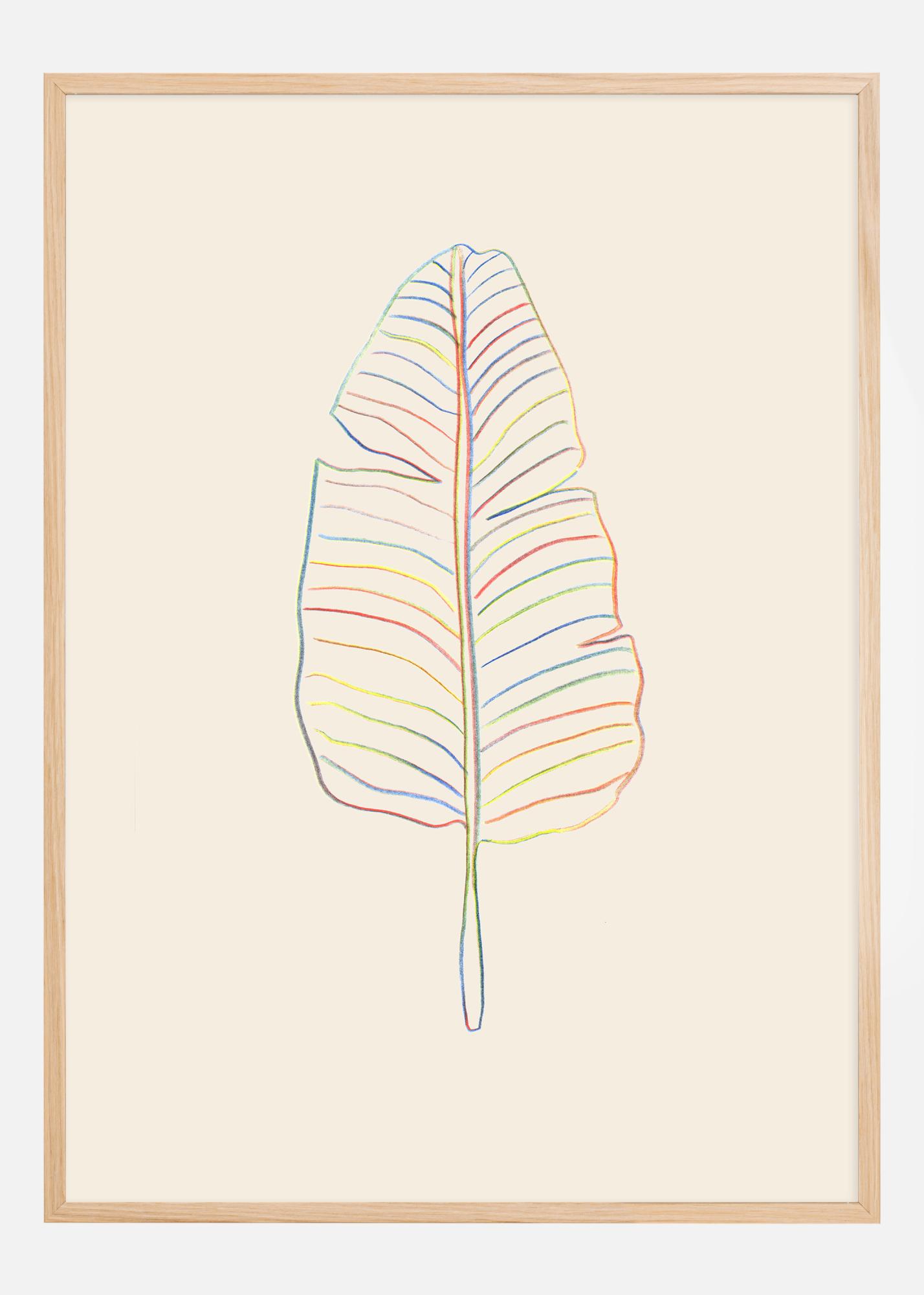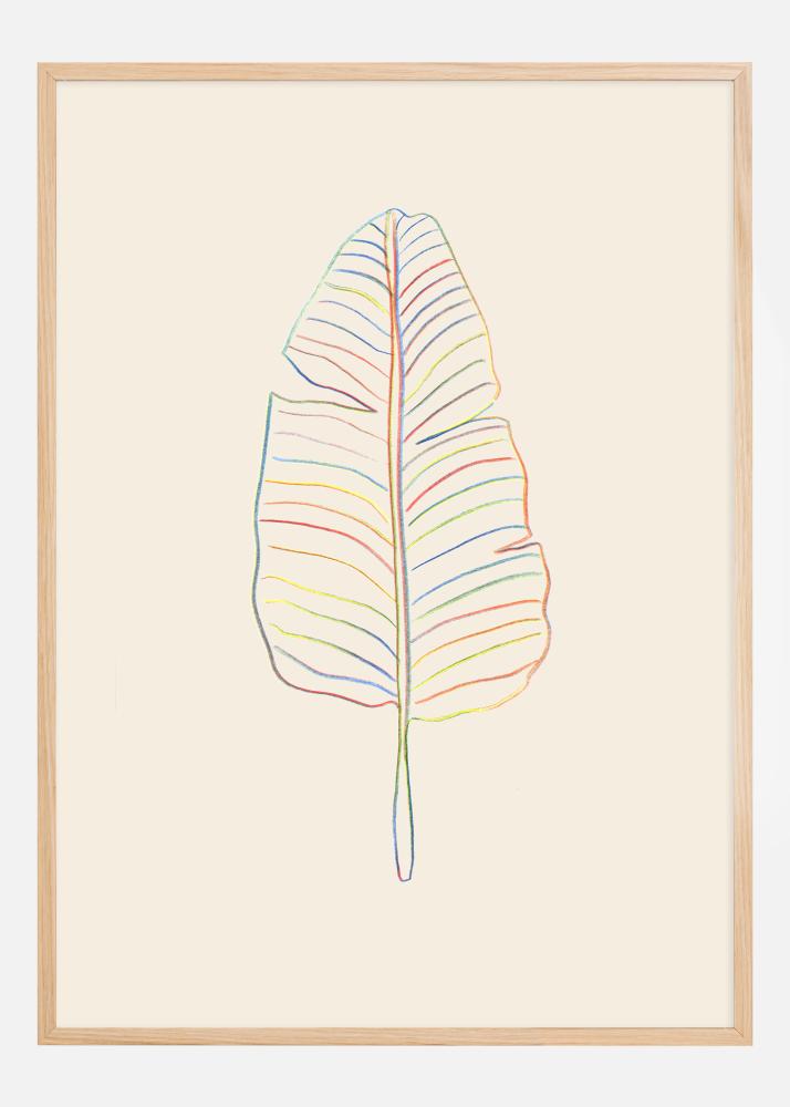 Този живописен и пъстър постер изобразява креативна интерпретация на бананов лист с линии в спектъра на цветовете на дъгата. Игривият контраст между естествените форми на листа и игривите цветове придава модерен привкус на класическото ботаническо изкуство. Този принт е отличен пример за това как класическите мотиви могат да бъдат трансформирани с нотка цвят, за да се впишат в модерната естетика.