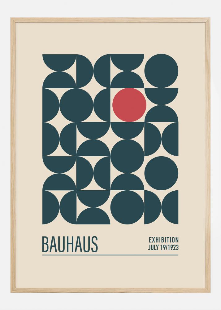 Този постер улавя минималистичната същност на движението Баухаус и неговия акцент върху геометрия и цвят. Графичната композиция се състои от припокриващи се кръгове в различни нюанси на синьото с акцентиращ червен кръг, който създава динамично и все пак балансирано визуално изживяване. Текстът "BAUHAUS EXHIBITION JULY 19/1923" намеква за изложбите на историческата дизайнерска школа, които бяха пионери в модерния дизайн.