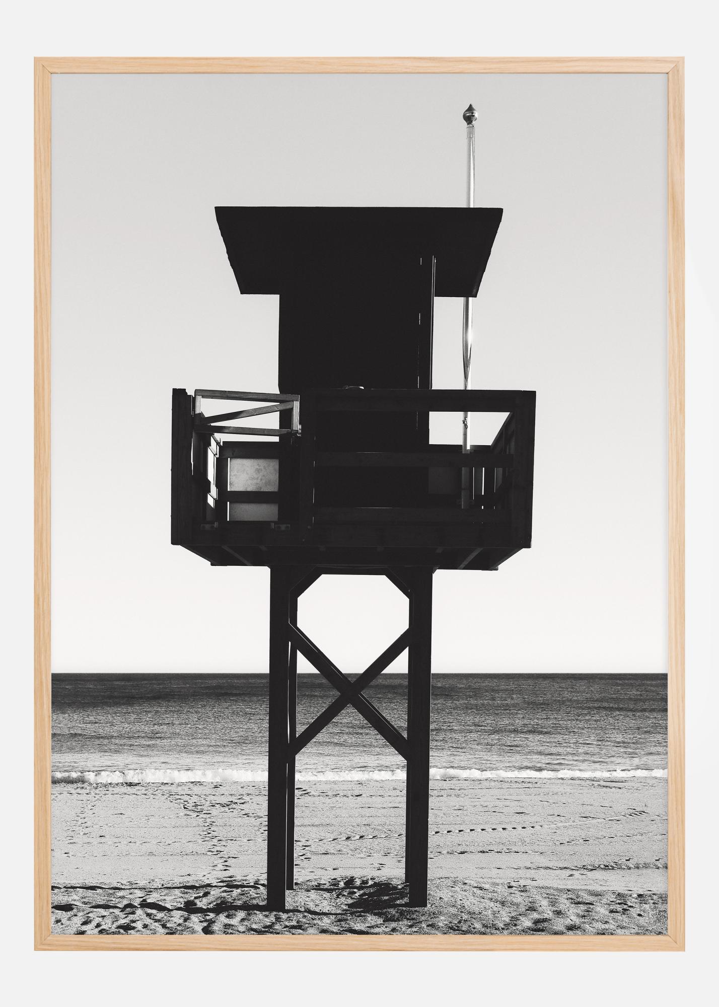 Този монохромен постер представя иконична силуета на спасителна кула на фона на ясно небе и спокойно море. Силният контраст между тъмната кула и светлите тонове на пясъка и небето придава на изображението графично качество, което е едновременно поразително и съвременно. Изображението, заснето на нивото на очите, създава усещане за присъствие и спокойствие, като ако стоите директно на плажа и гледате към обширното море.