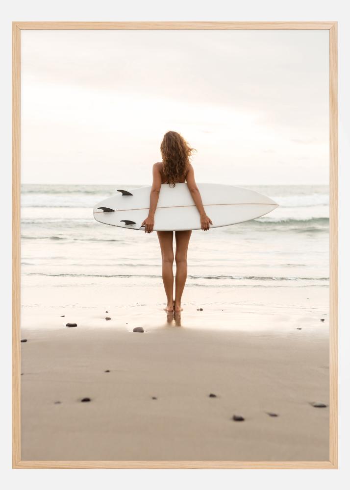 Една чудесна фотография на жена на плажа, държаща сърф зад гърба си, гледайки към хоризонта. Истински позитивен постер с меки тонове и форми. Подходящ за повечето домове и интериорни стилове.