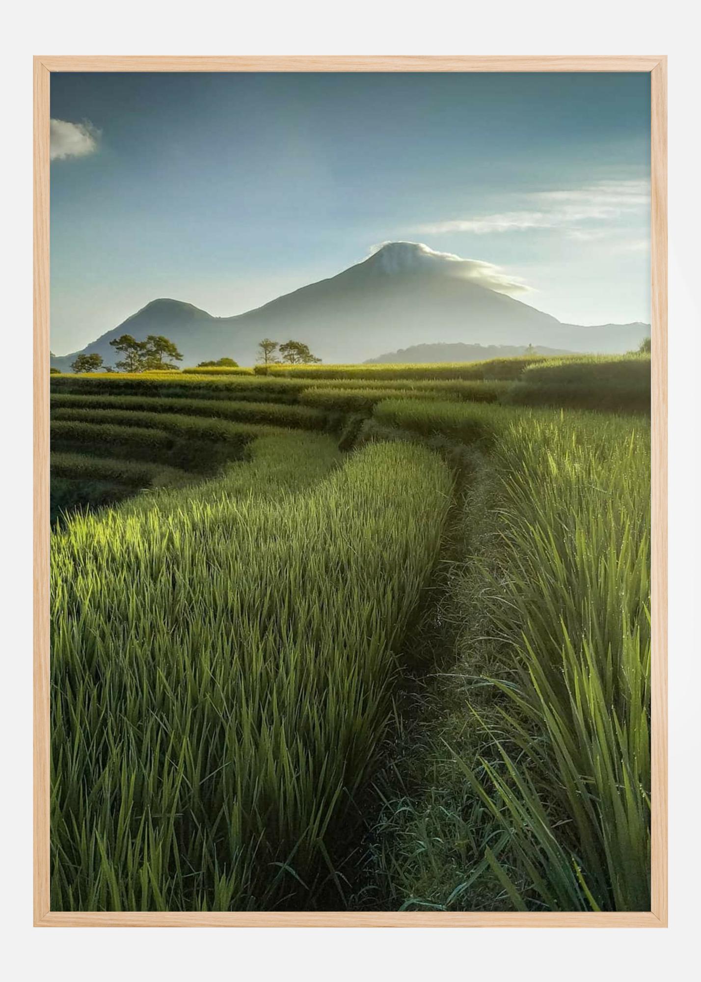 Този плакат предлага поглед към пасторална идилия, където зелените оризови полета се разпростират на фона на величествени планини и меко небе. Светлината, която се разлива над пейзажа, създава топло и приветливо усещане, което прави този принт перфектен начин да внесете частица от природната спокойствие и красота във вашия дом или работно място.
