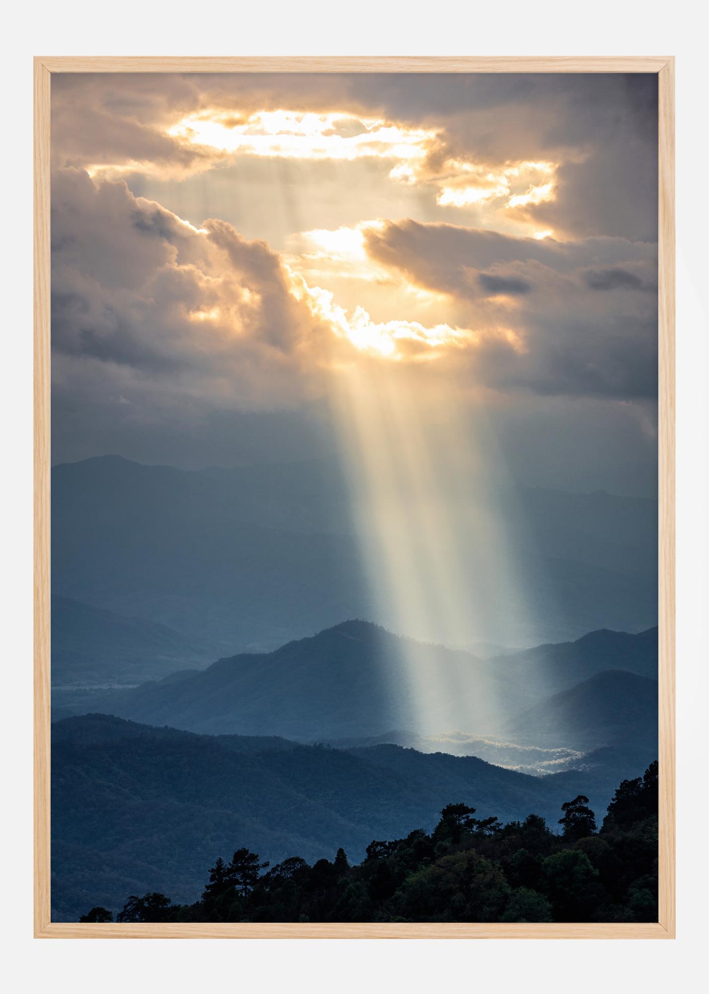 Този вдъхновяващ постер изобразява величествен пейзаж, където слънчевите лъчи пробиват облаците и осветяват вълнообразните планини. Това е сцена, която улавя възвишената красота на природата, с драматично небе, което контрастира с меко очертаните планини. Сенки и светлина играят над пейзажа, създавайки силно усещане за дълбочина и простор.