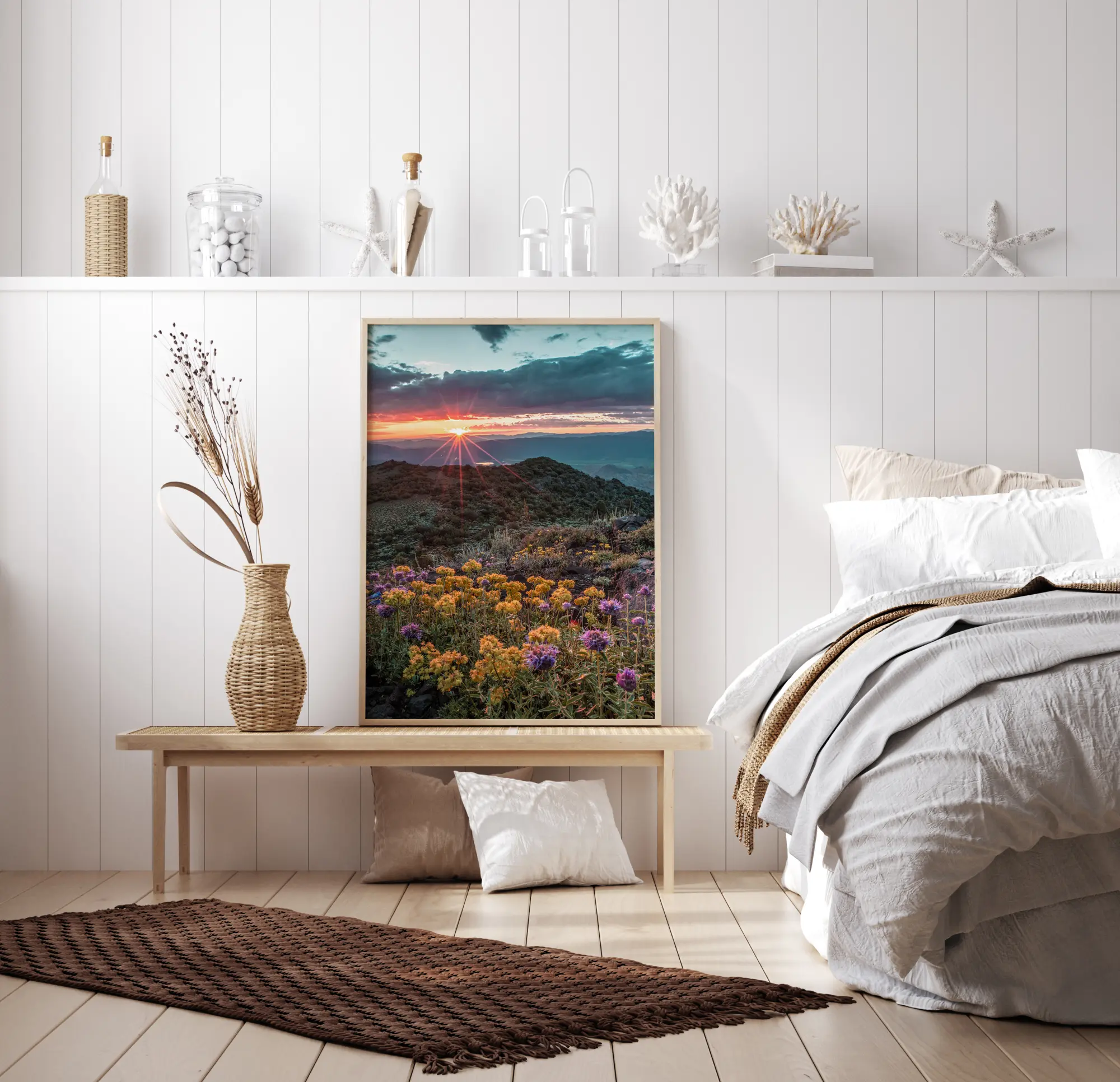 Естествен плакат с диви цветя на планински склон срещу невероятен залез. Красива жълта и лилава цветя запълват изображението, водейки погледа към върховете на планината и замъгленото небе. Залезът изглежда като червена звезда, което създава изразена фокусна точка. Закачете това произведение на вашата стена, за да изпитате част от природата у дома.