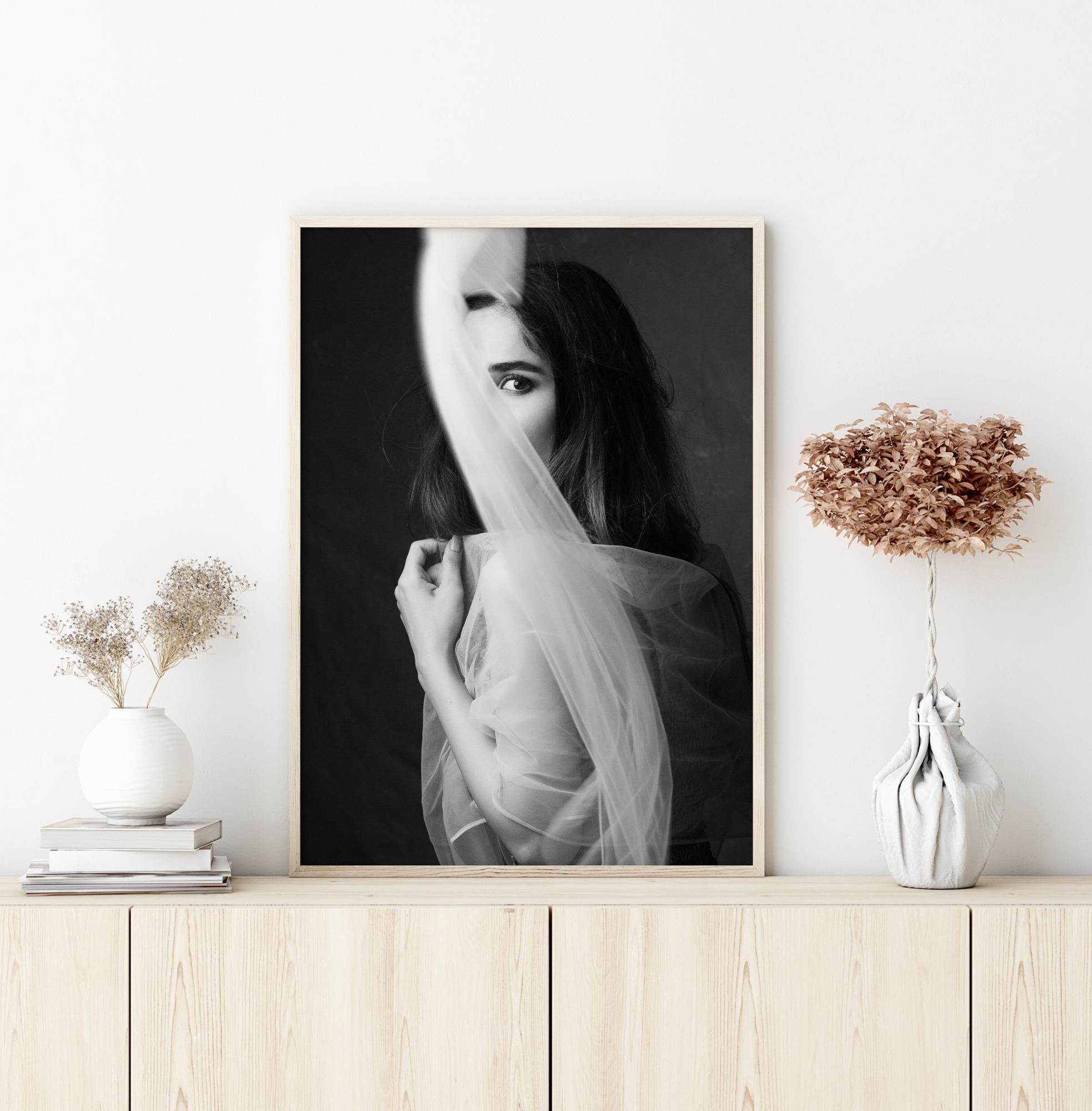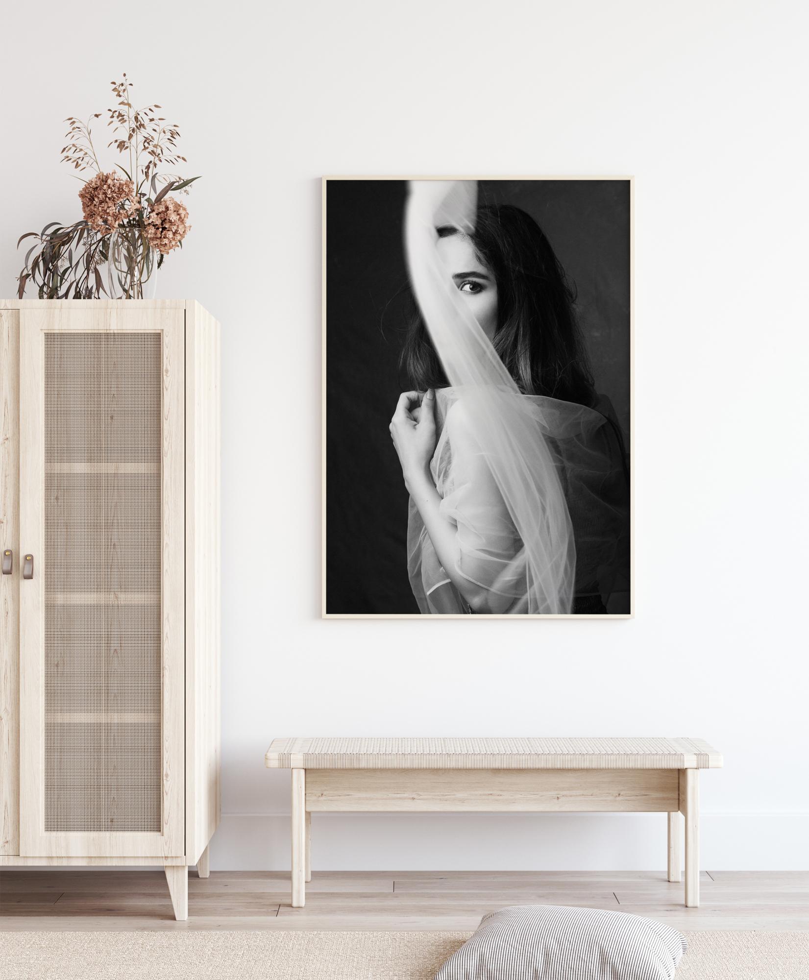 Сетивна снимка на жена, която се крие зад завеса. Мекото свилянето на завесата привлича погледа към лицето на жената. Този плакат ви пренася на спокойно място, където можете да установите контакт.