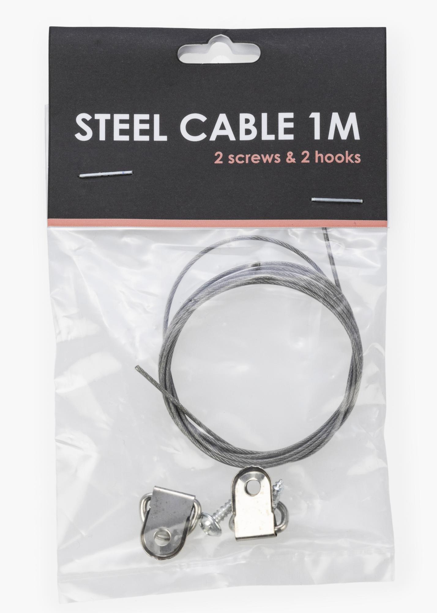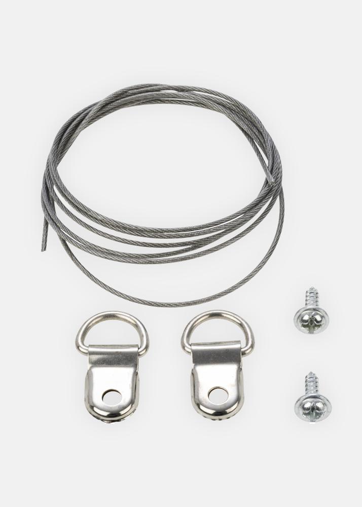 С този комплект имате всичко необходимо за монтиране на стоманено въже на вашата дъска: 1 метър дълго стоманено въже, 2 винта и 2 халки/куки. Стоманеното въже е поцинковано и здраво, но само 0,7 мм дебело, което го прави лесно за работа, тъй като може да се огъва и усуква според желанието.