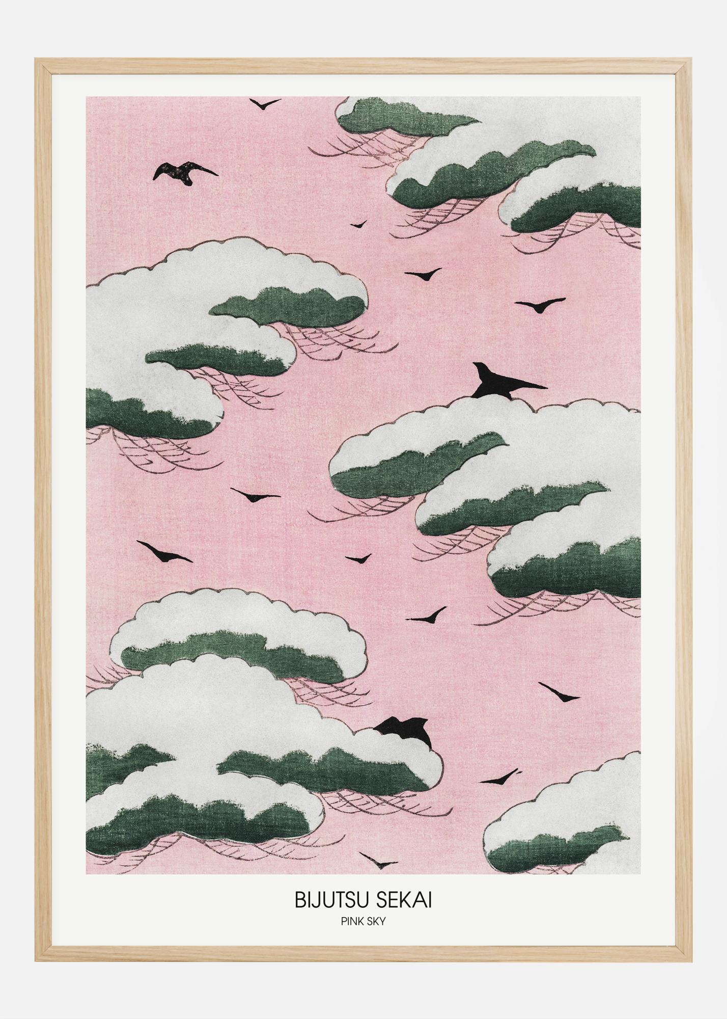 Този успокояващ и поетичен постер със заглавие "Bijutsu Sekai Pink Sky" улавя същността на спокойна сутрин или вечер със своето мека розово небе на фона на елегантно плуващи облаци и силуети на летящи птици. Тази печатна материя е оазис на спокойствие и би паснала перфектно в спалня или пространство за медитация, където може да предаде усещане за мир и размисъл.