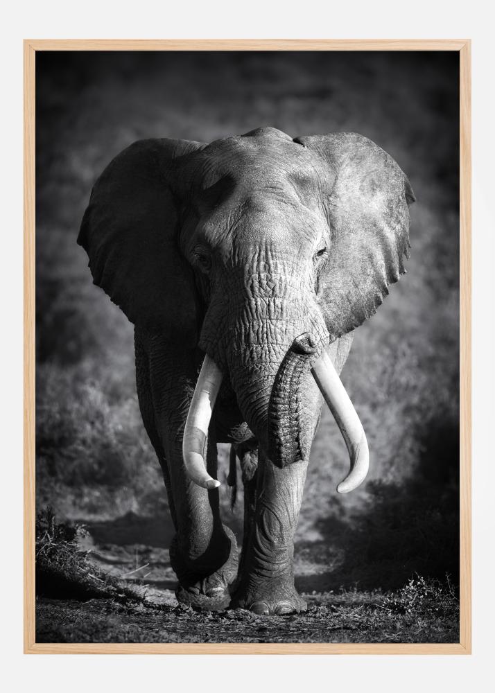 Този въздействащ и пленителен плакат изобразява слон в черно и бяло, което подчертава набръчканата кожа и големите бивни на тази великолепна същност. Достойното присъствие на слона е уловено в детайл, а спокойният му поглед предлага усещане за мъдрост и вечност. Този образ е идеален за всеки, който цени дивите животни и силната красота на природата и иска да добави изразителен и провокиращ мисли елемент в дома или офиса си.